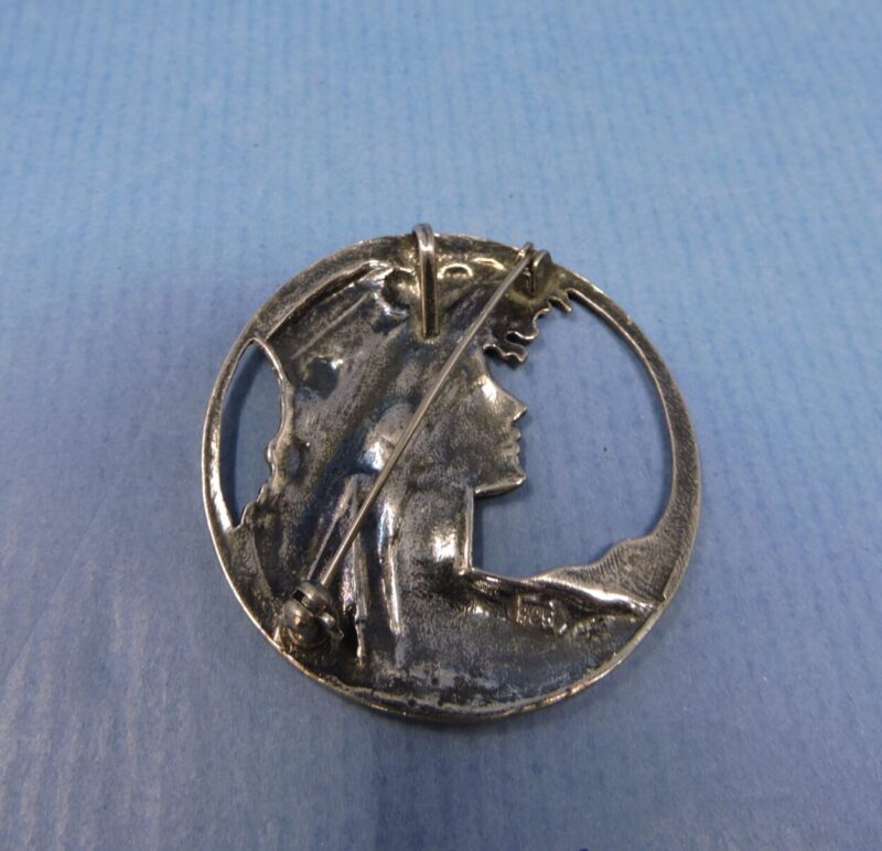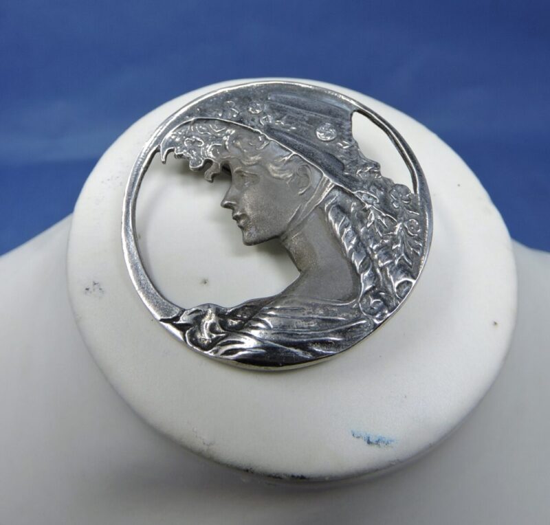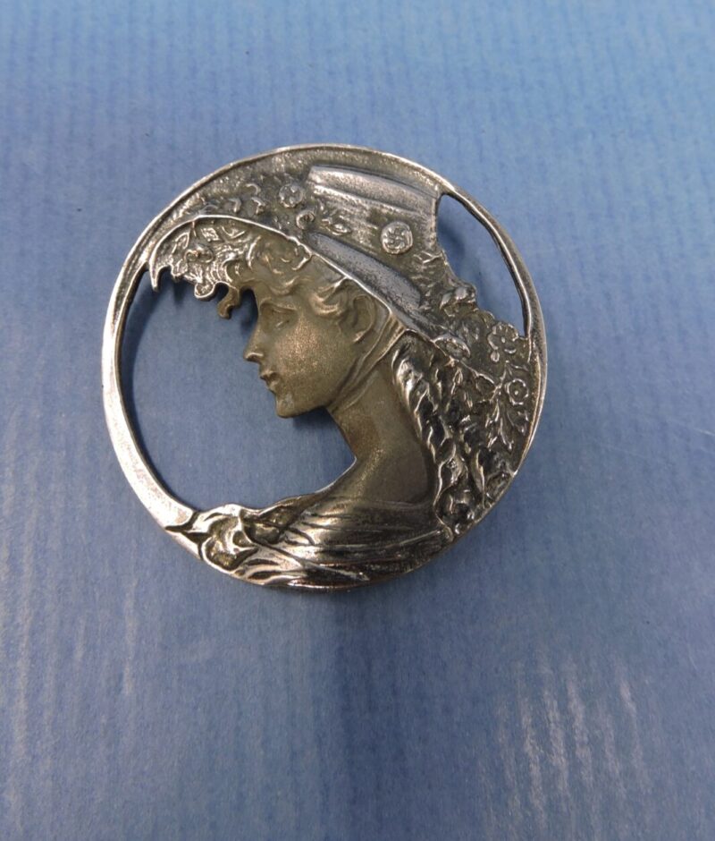 A lovely American sterling silver brooch (with an attached bale so it may also be worn as a pendant) in the Art Nouveau style, showing the profile of a woman wearing a hat.