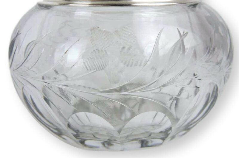 A ‘American Sterling Webster Company Dresser Jar- dates circa 1895,  N. Attleboro Massachusetts. Features a beautiful cut crystal base with a deep cut geometric flower pattern, and a sterling silver lid decorated with leaf, floral and scroll motifs.