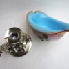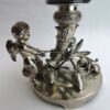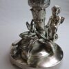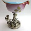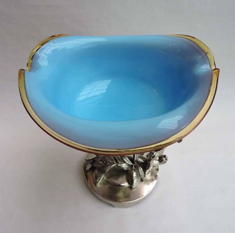 A fantastic quality American Victorian bride’s basket with a quadruple silver plated figural base of a cherub holding a cornucopia with a cased Peachblow pink glass bowl that transitions to a robins egg blue interior glass. The bowl is attached with a silver plated dowel that inserts into the cornucopia – so it is original to the piece. The bowl is decorated with gold leaves on the outside – it is most likely made by Mt Washington. I have seen other examples of the peachblow outer to robins egg blue inner glass throughout the internet – and the quality of the glass is high.