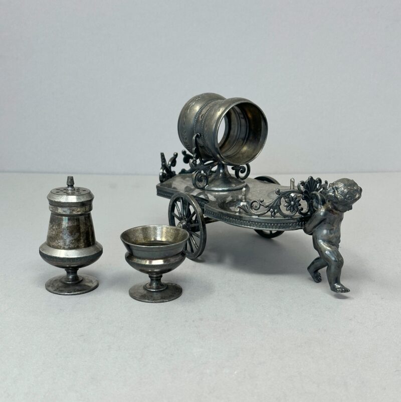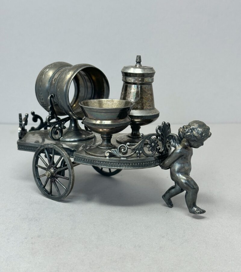 American Victorian Three Piece Napkin Ring + Salt and Pepper on Wagon Pulled by Cherub – Simpson, Hall & Miller Quadruple Plate