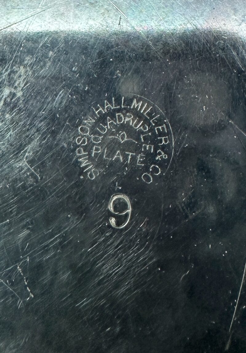 This unique three piece napkin ring includes a napkin ring, one salt, and one pepper, all on an absolutely beautiful wagon pulled by a cherub. The set is silver plated and is marked Simpson Hall Miller & Co. Quadruple Plate #9. This is a rare napkin ring.  Overall, this set would make a great addition to any Victorian napkin ring collection.