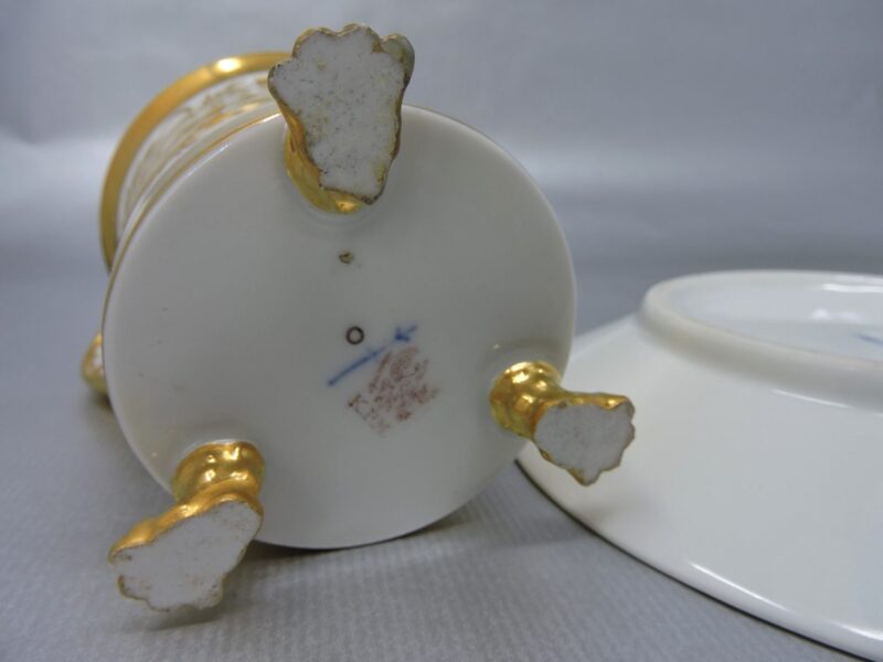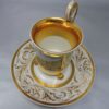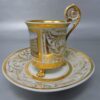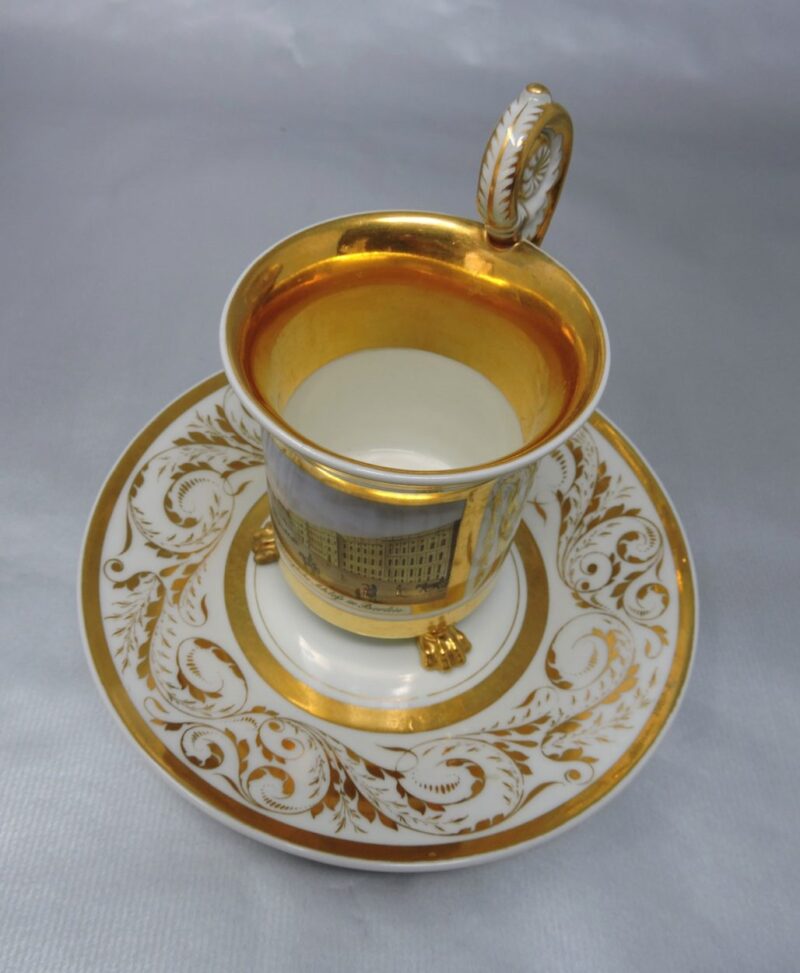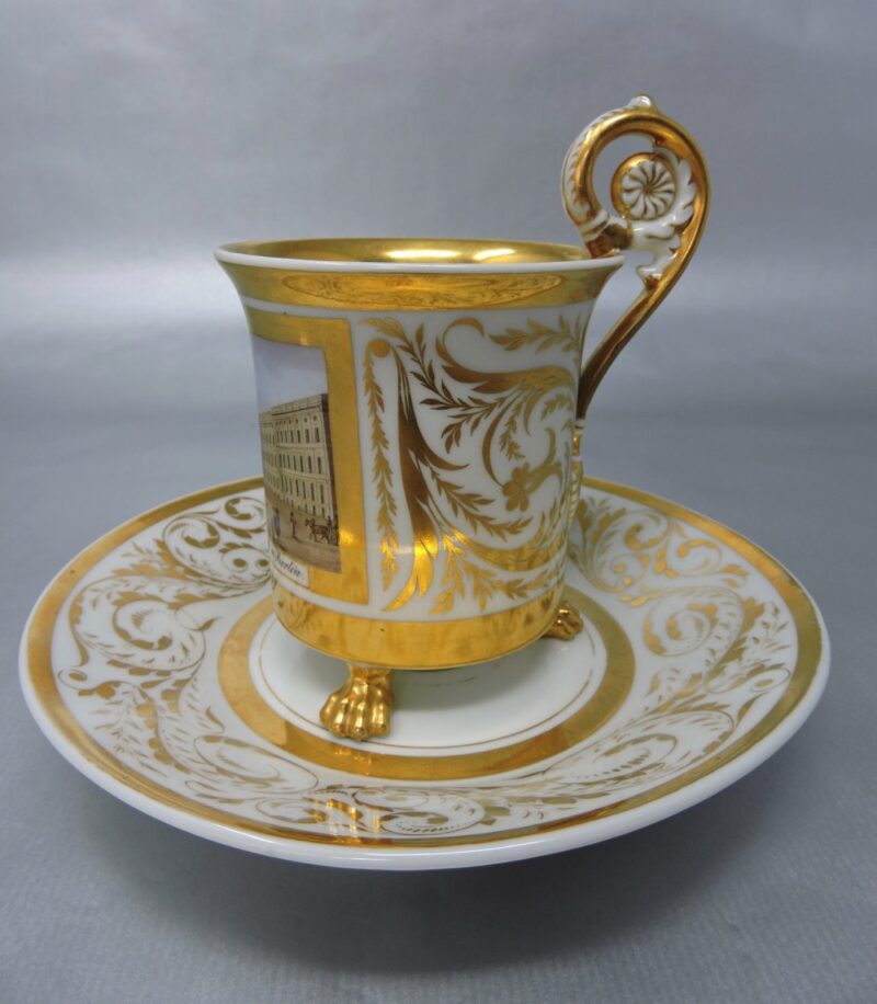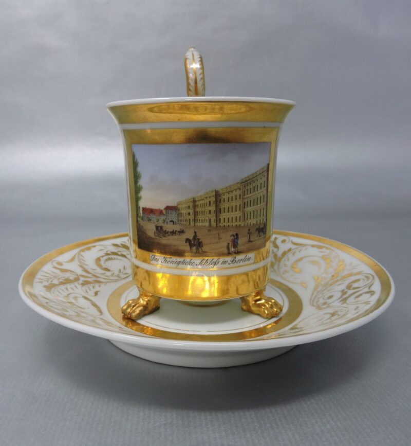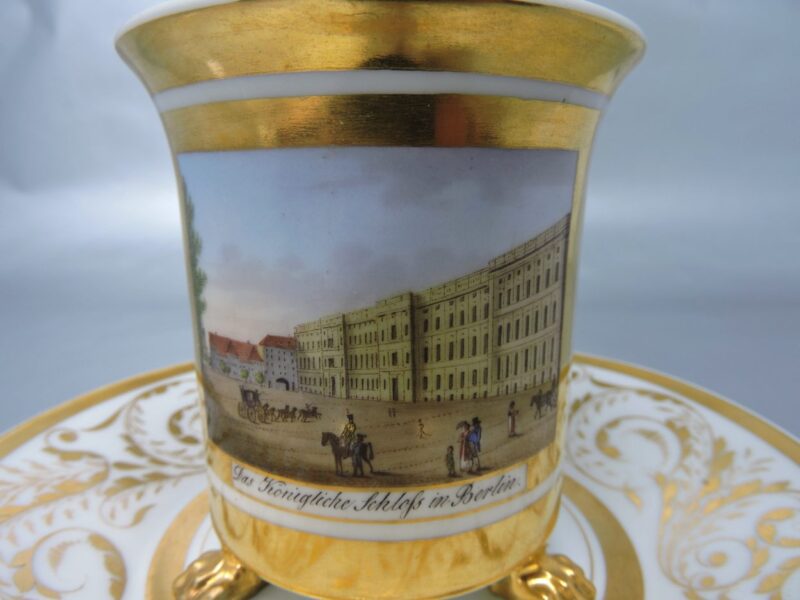 A finely painting German , KPM ‘Berlin’ topographical cup and saucer circa 1845.  The cup hand painted with a scene of Berlin Palace.  The cup rim interior and exterior with a sold gilt banding on 3 lion paw shaped feet. The large saucer hand gilding over a white background.
