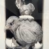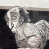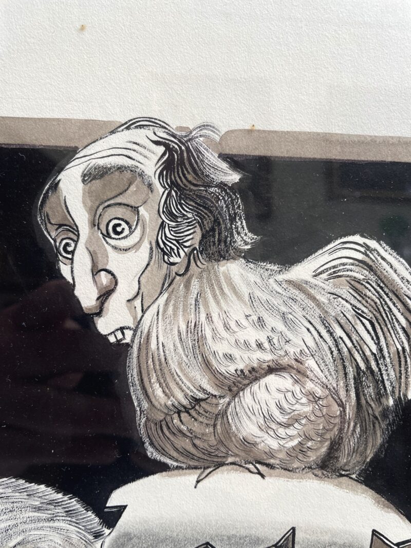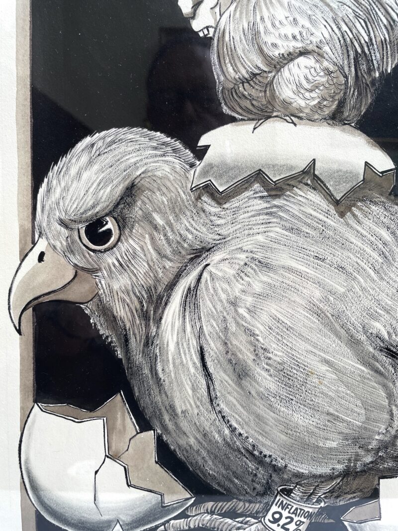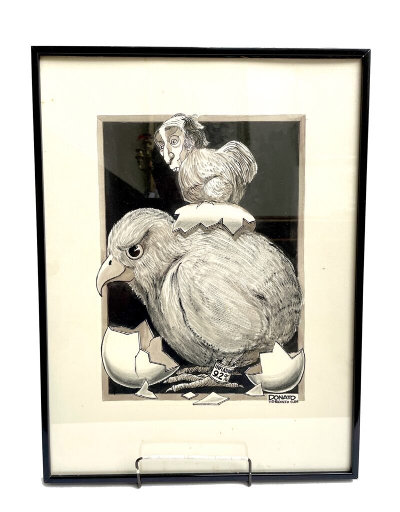 This funny ink painting seems to depict Pierre Elliot Trudeau “laying an egg” that grew just as inflation did when he was prime minister. Andy Donato was a very popular political satirical comic artist for the Toronto Sun.