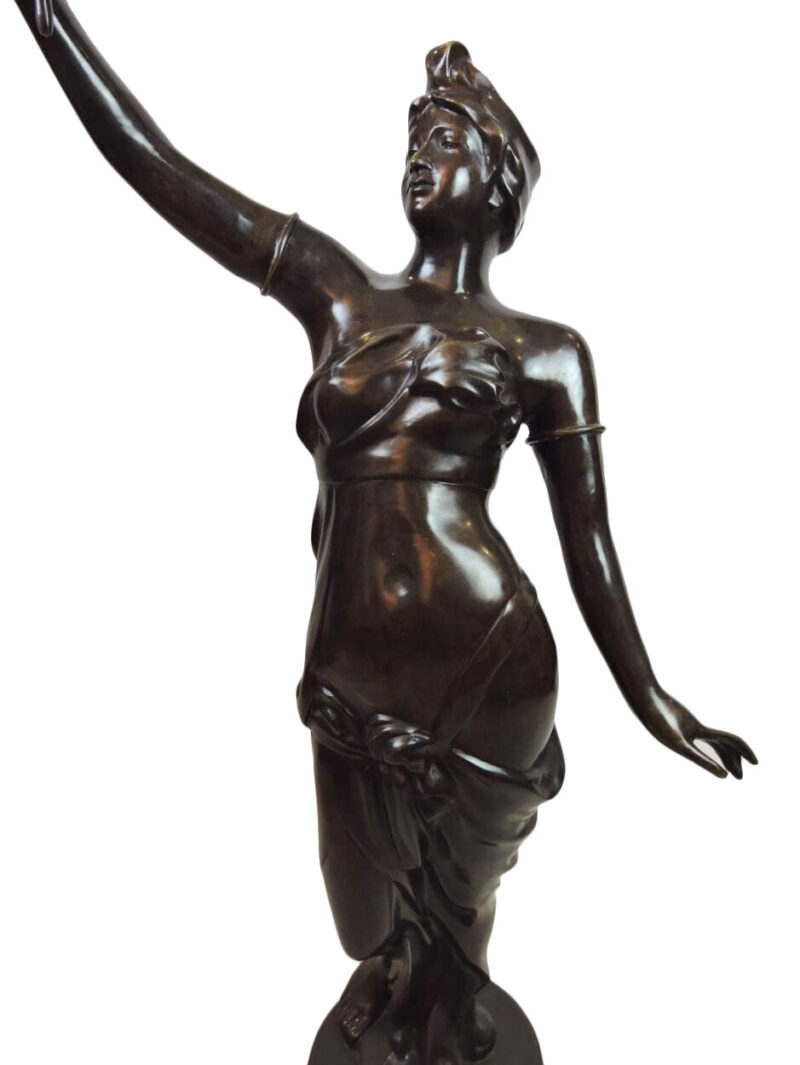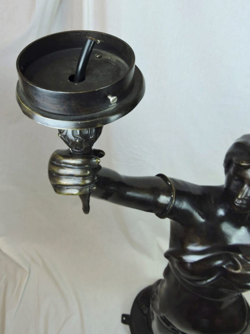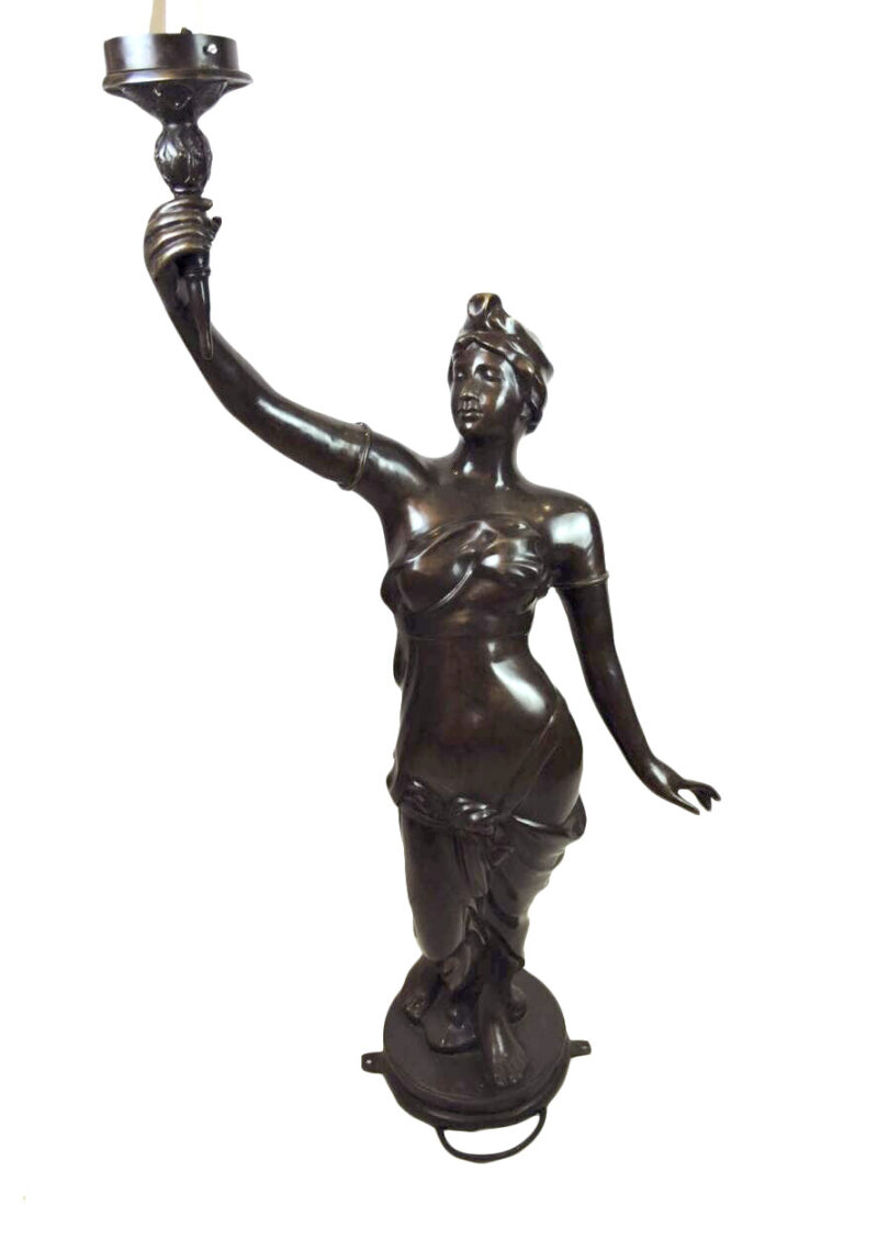 Antique Art Nouveau Style Bronze Figurine of a Woman Holding a Torch Base, 53 inches High.