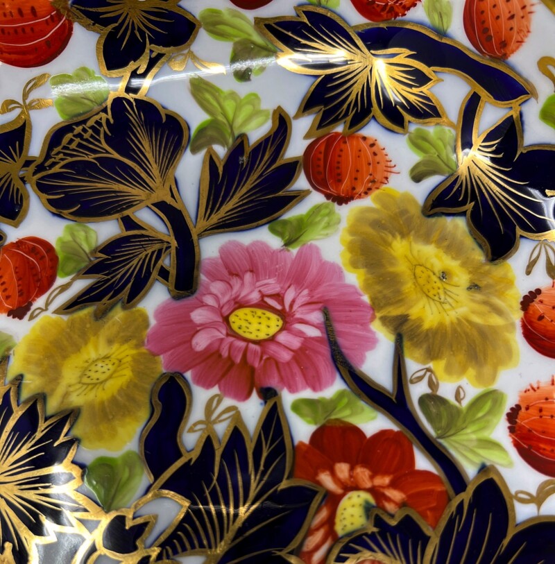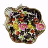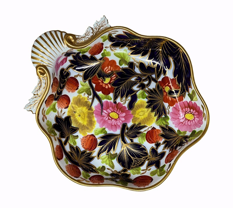 A rare antique Coalport shell dish with a rich combination of cobalt blue leaf patterns set against delicate sweet clusters of strawberries and pastel flowers. The elaborate gold gilt shell and frond moldings provide the handles for this amoeba shaped dessert dish.