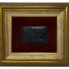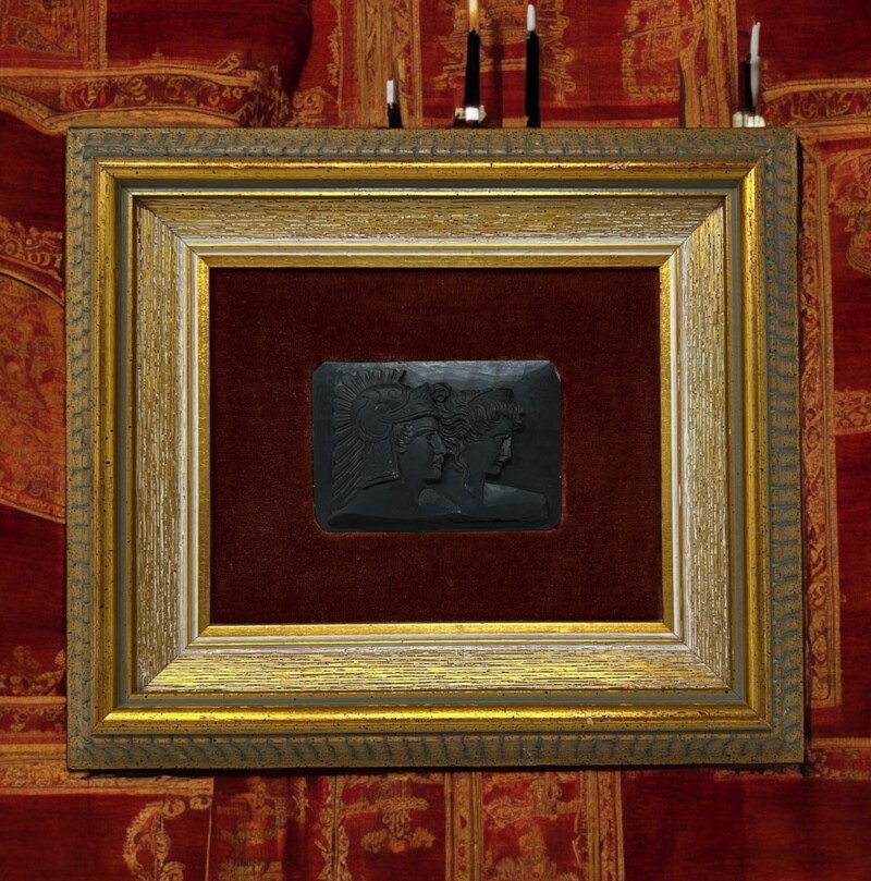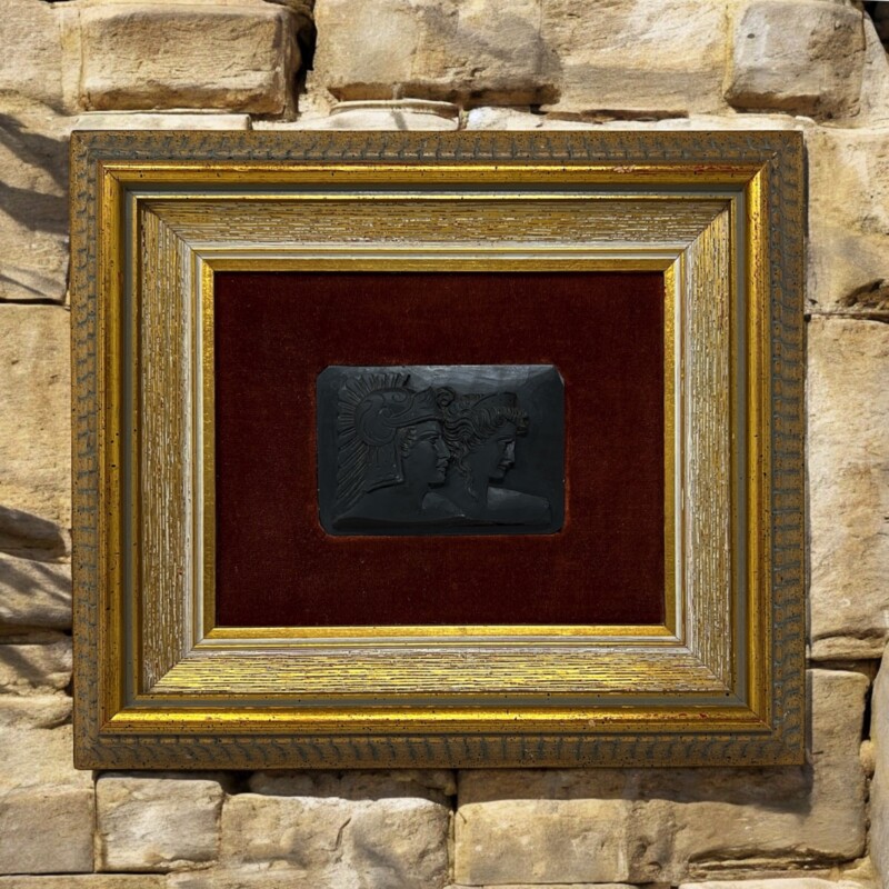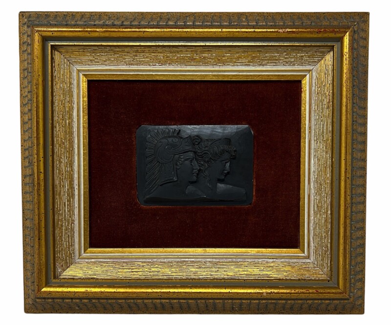 Simply beautiful.  A high relief hand carving in black lava stone depicting portraits of a Roman military couple with great detail.  Lava stone carvings in this sculptural relief  “art framed format” are rare as most are found in the form of carved lava stone “cameo” jewelry.  Lovely gold painted wood frame with a “wine red” velvet matt. Considering its age the stone is in very good condition having minor bezel marks.