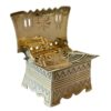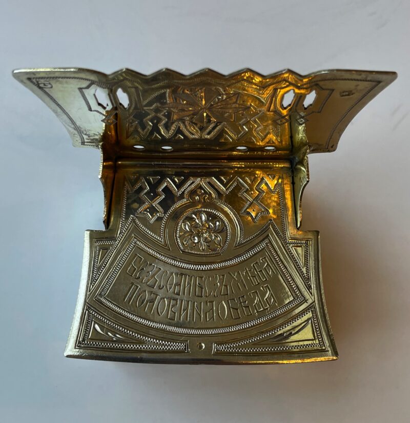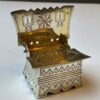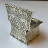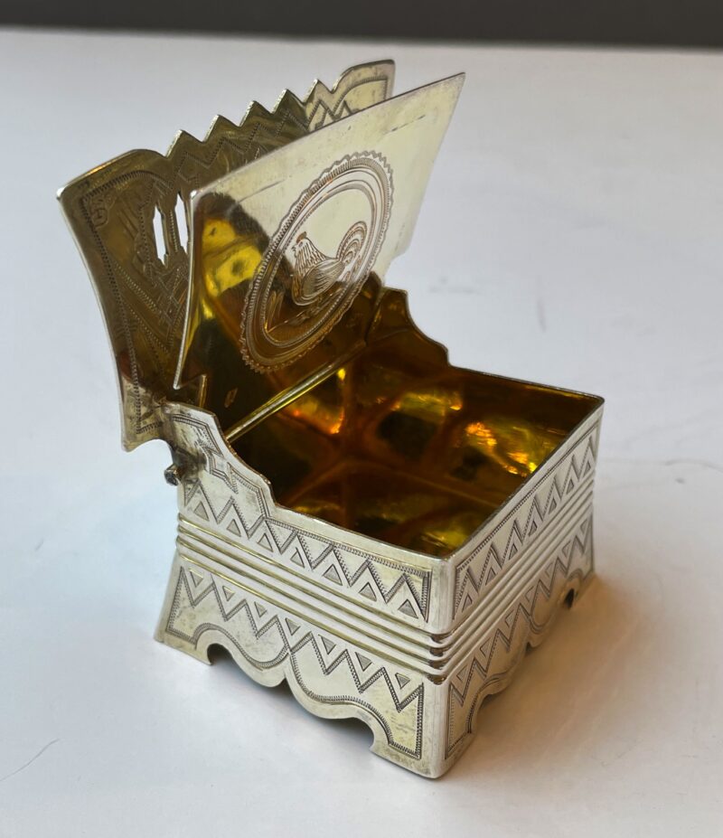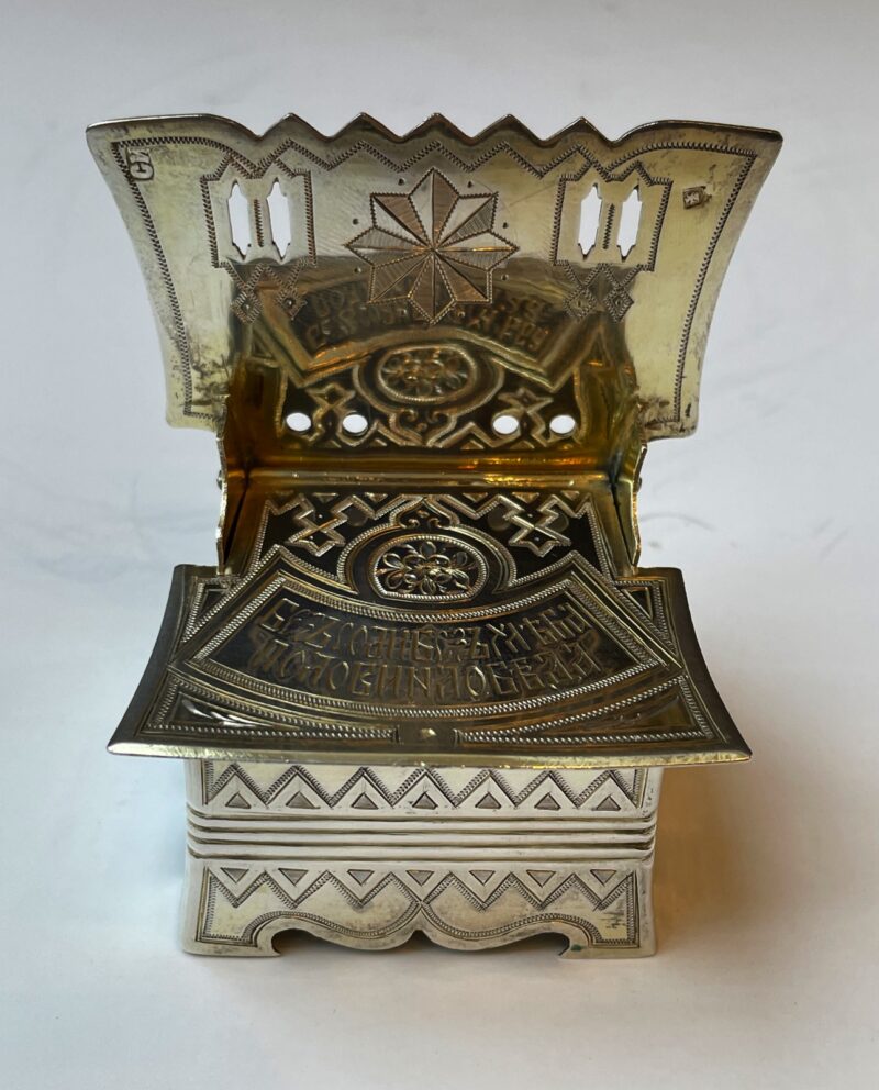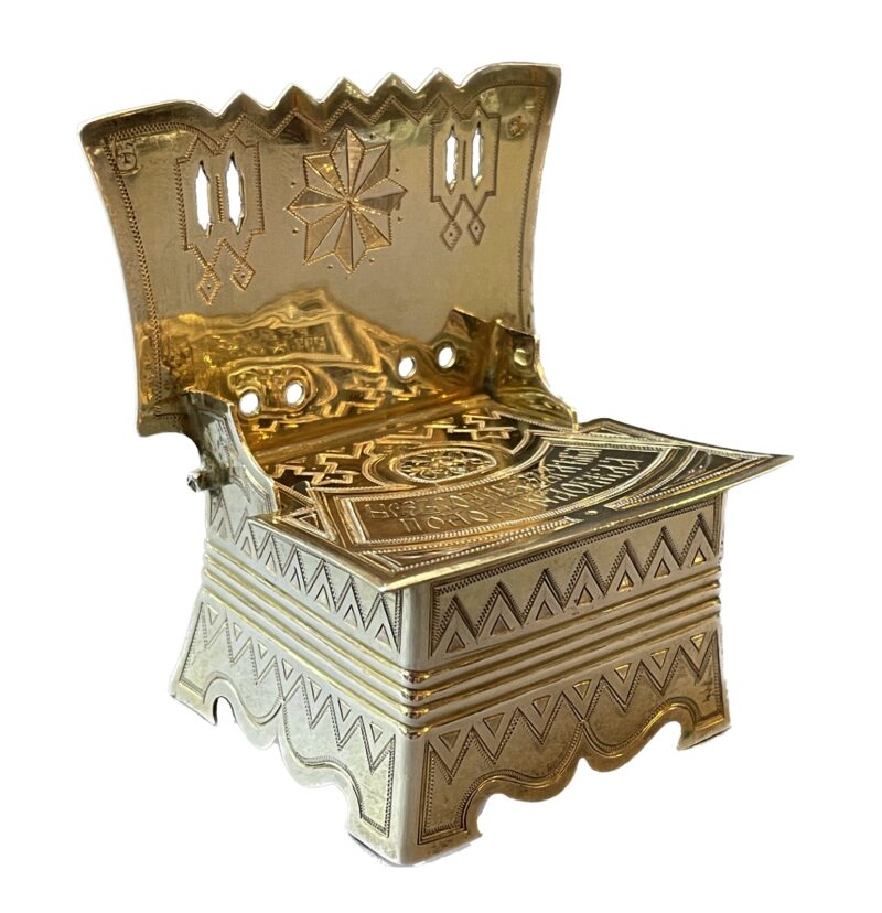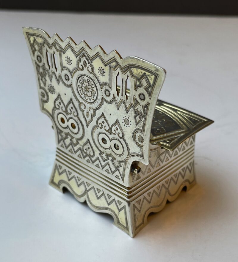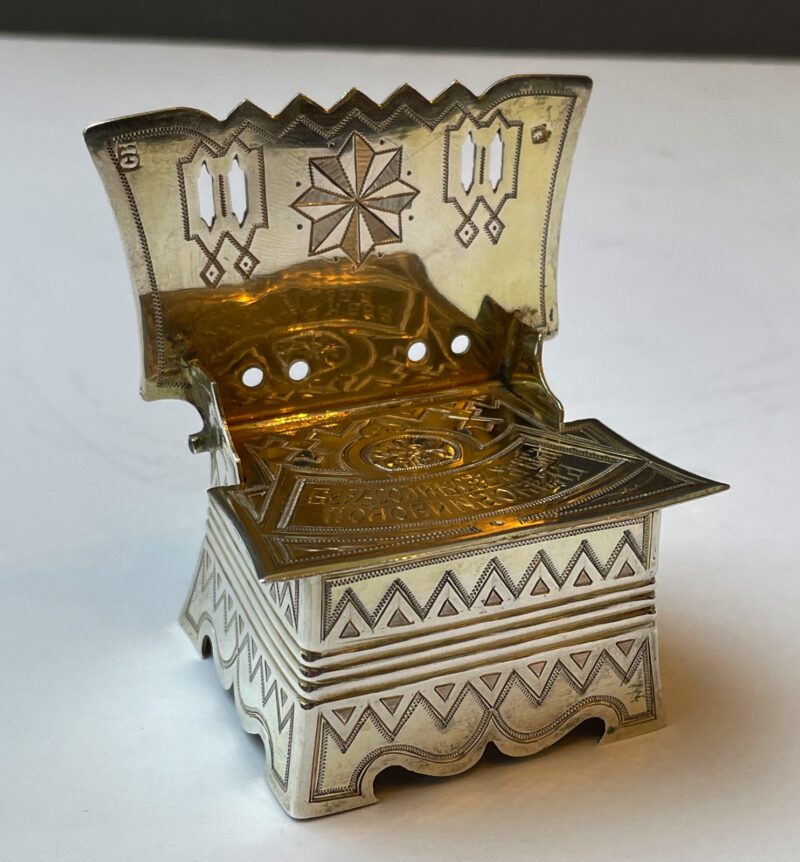A rare Russian silver Throne shaped salt cellar – known as a Salt Throne.  The silver is all hand chased, front and back with a seat that lifts to store the salt.  The interior is gold washed with an engraved chicken on the interior of the lid.  Russian writing in cyrillic characters on the top of the seat which loosely translates to “Lunch without salt is just half a meal”.