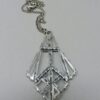 A wonderful Art Deco period blue glass pendant with reticulated / hinged panels and a metal frame. The pendant is hung from an adjustable silver tone metal chain with a lobster claw clasp.