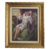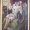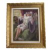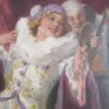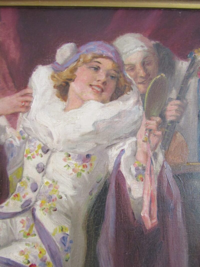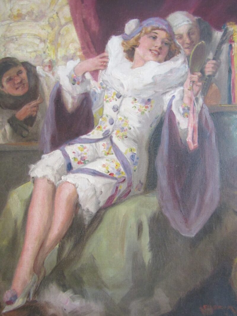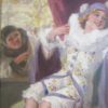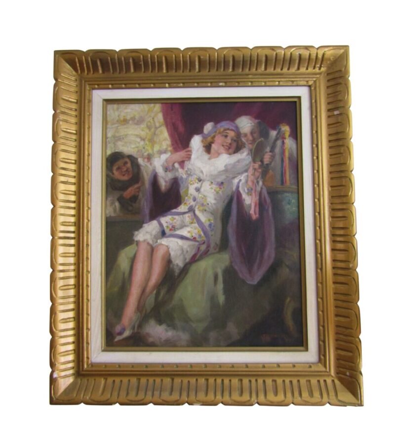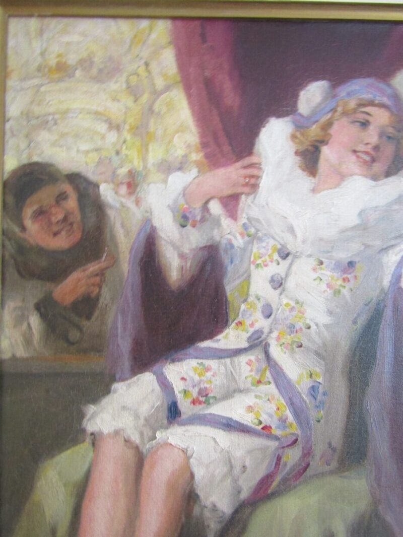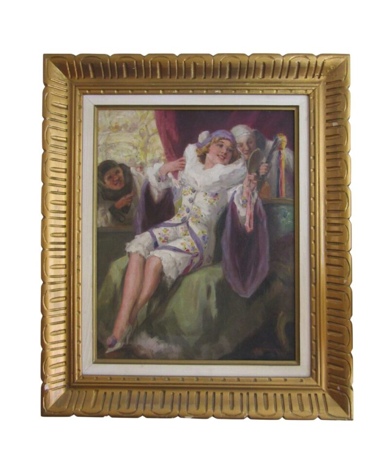 A playful and colourful oil on canvas of a very pretty Columbine seated and looking at herself with a hand held mirror.  2 male Harlequins look onwards, one from an open window and the other from behind – he holds a lute in his hand.
