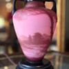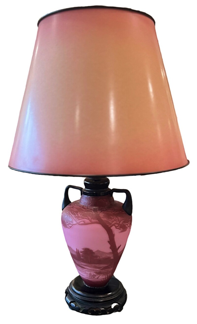 A beautiful Art Nouveau burgundy and pink cameo glass table lamp with a landscape scene of a lake, trees and architectural images.  The glass lamp body is made by the Austrian Loetz factory under their cameo line “Richard” made after 1918 to compete in the French market with Gallé and Daum Nancy. Etched and engraved decoration in burgundy red against a pink background and signed “Richard”. The base is carved wood.