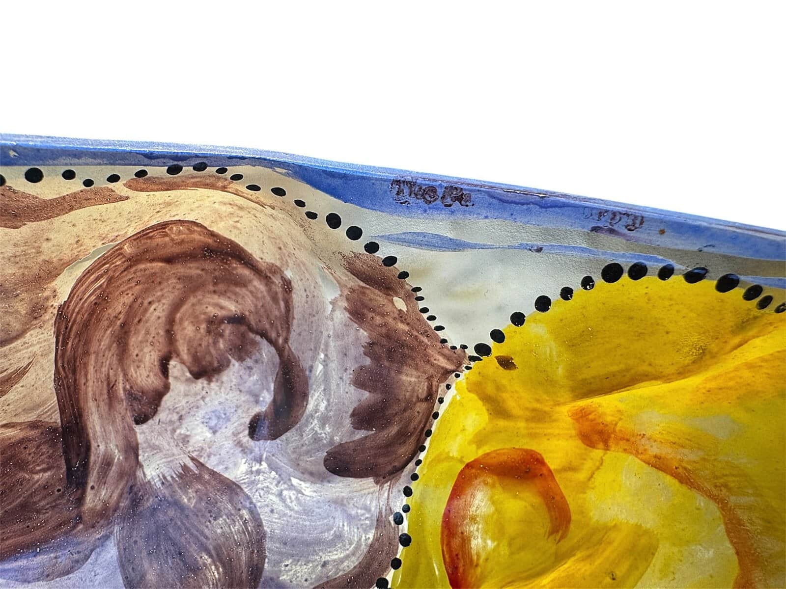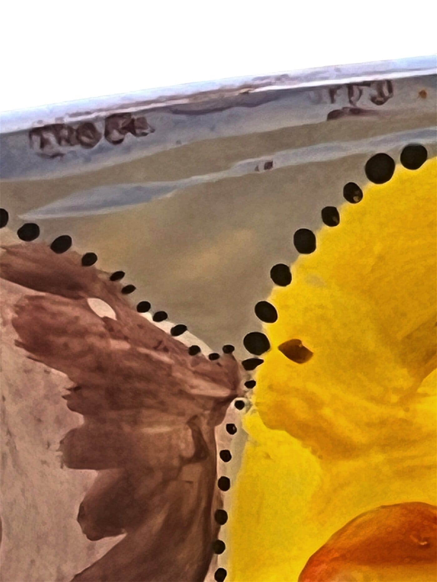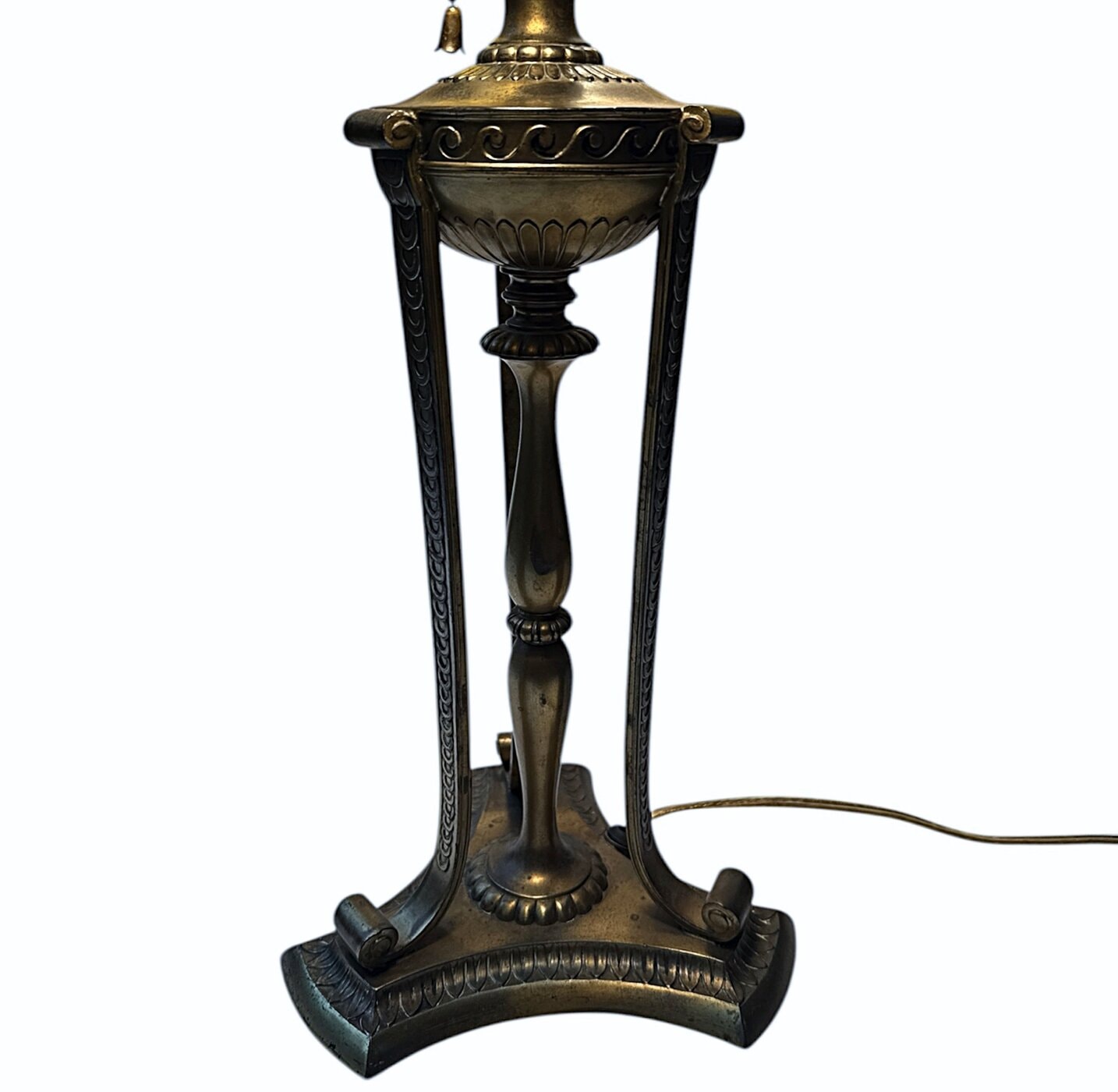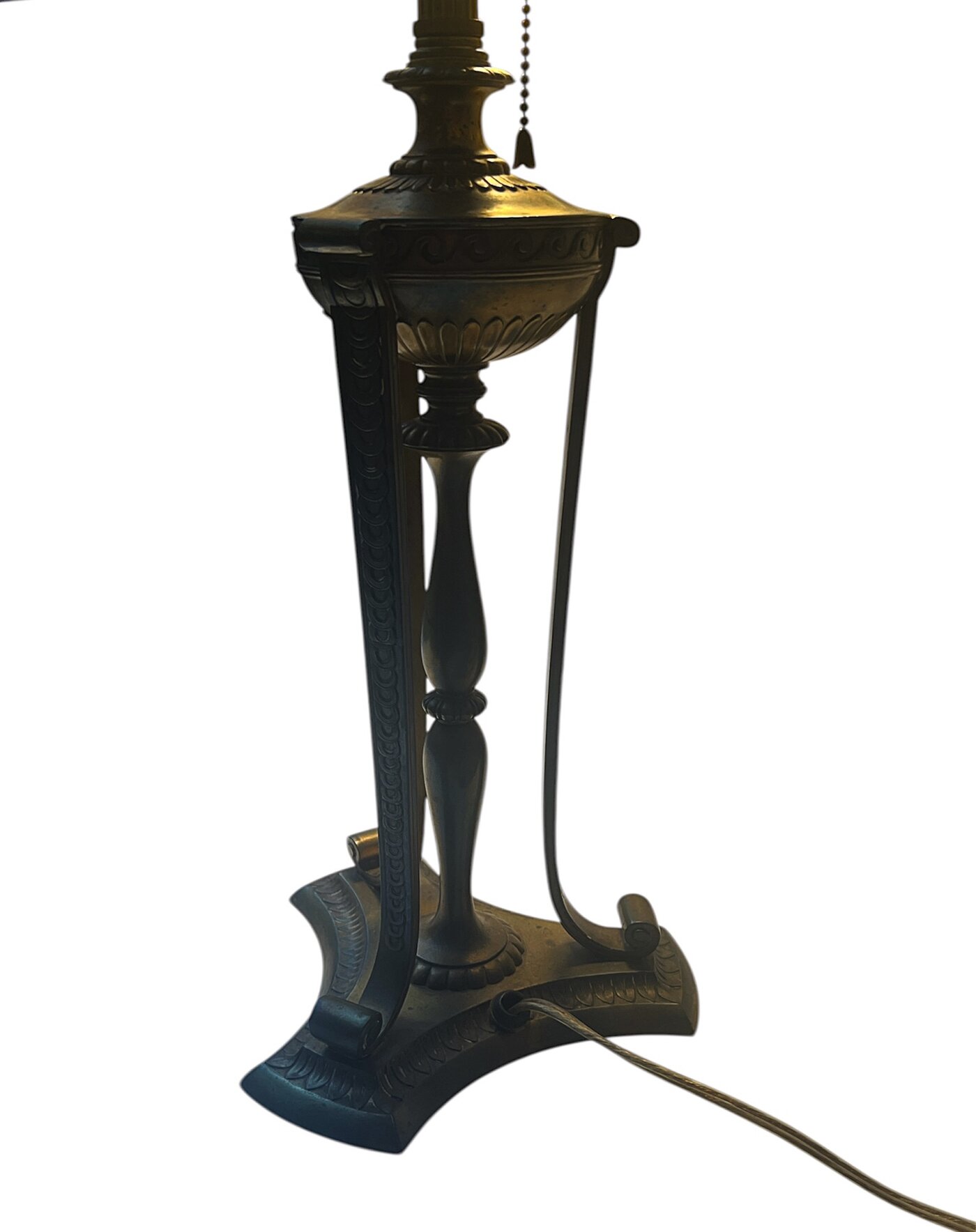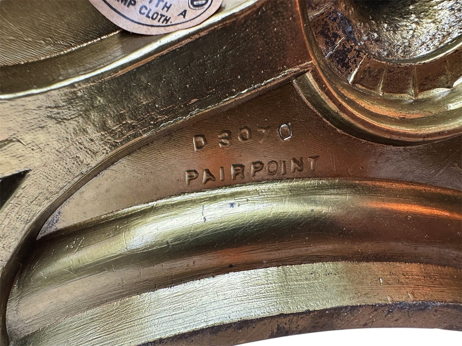 The lamp is supported by its original, tri-form metal base, model number D3070. This tripod-style base features a classic baluster stem and retains its original aged patina. The underside is clearly stamped with the “PAIRPOINT ” name and the shade also signed . This combination of the sculptural Stratford shade and trim-form metal base represents a rare and sophisticated acquisition, in excellent condition, a collector’s dream.