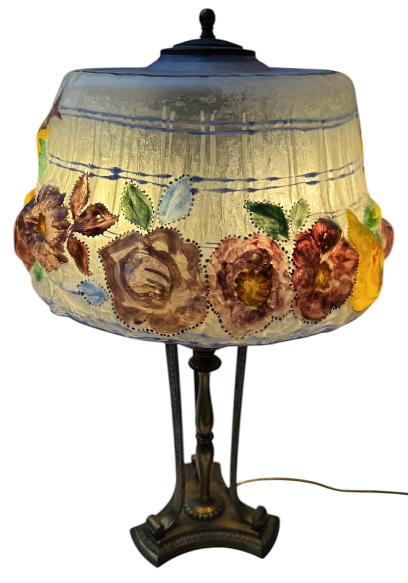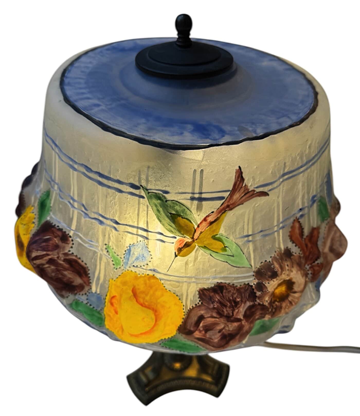 Art Glass / Crystal, LightingStunning Pairpoint Puffy table lamp is a premier example of American Art Nouveau craftsmanship, featuring a highly desirable “Stratford” shade, characterized by its unique 3D mold-blown glass and subtle basket-weave texture. The shade was meticulously acid-etched and reverse-painted by hand and signed, creating a luminous scene of roses and a hummingbird that glows with exceptional depth when illuminated. The unique shade design with a wide floral band of a hummingbird and roses are on a frosted colourless linenfold field with blue borders and “art nouveau” style metal base.