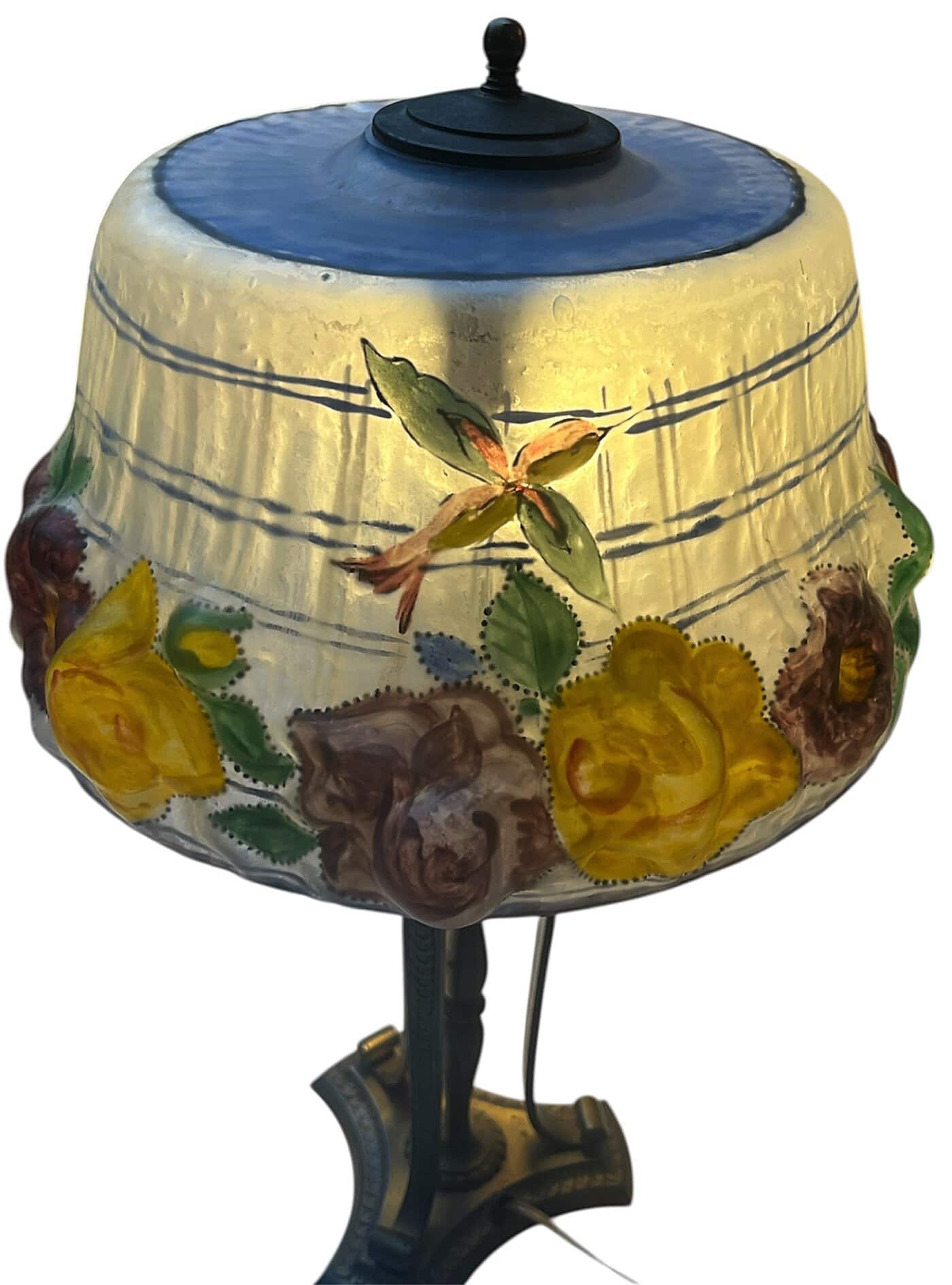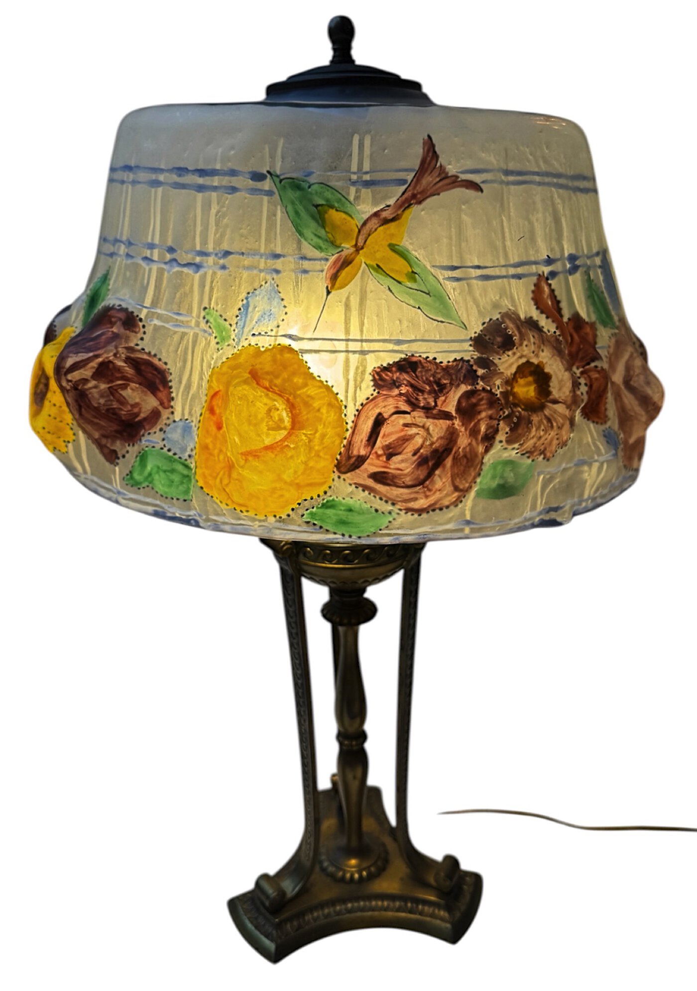 Art Nouveau Pairpoint “Puffy” Reverse Painted Lamp , Stratford Shade w/ Hummingbird & Roses on Tri-form Base, Circa 1910