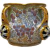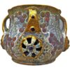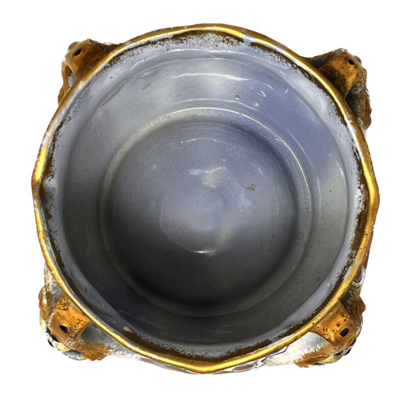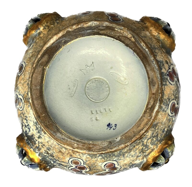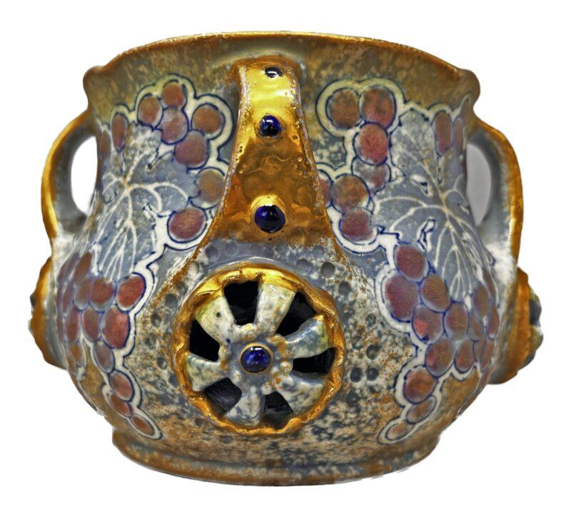 An exceptional piece from the Art Nouveau period and of Amphora pottery from Austria. The bottom of the vase has ” impressed ” markings of ” Imperial Amphora” plus the word “Amphora”. It is also numbered.  Beautiful earthy tones in the surface grape motifs as well as the soft intensity of the interior glaze lilac colour. The wonderful contrast is the gold “art nouveau” sculptural details on the handles. Truly a unique and unusual find.