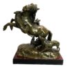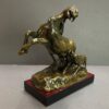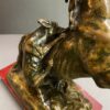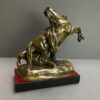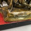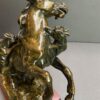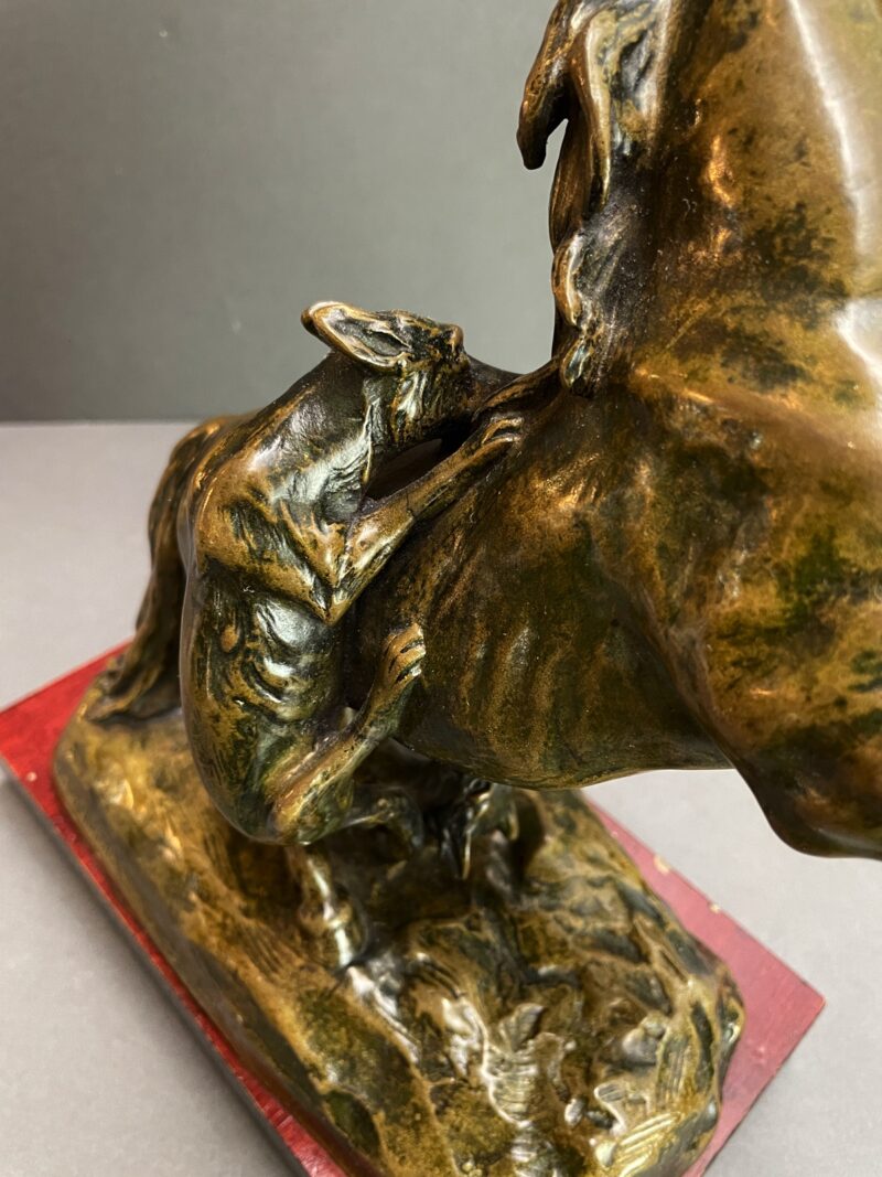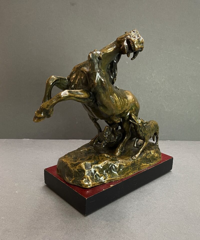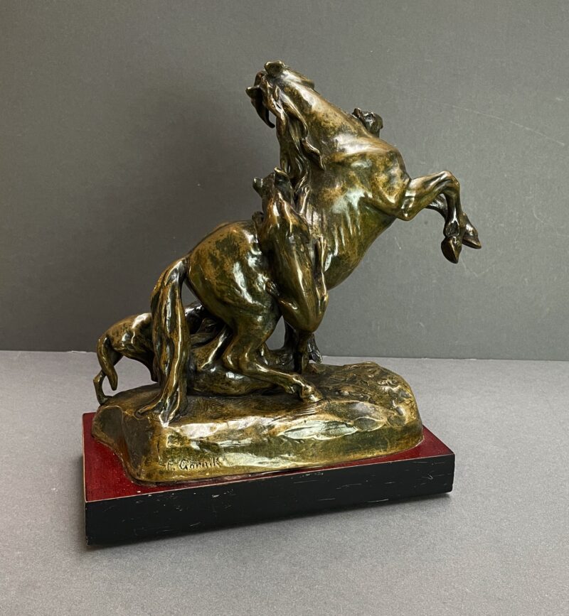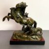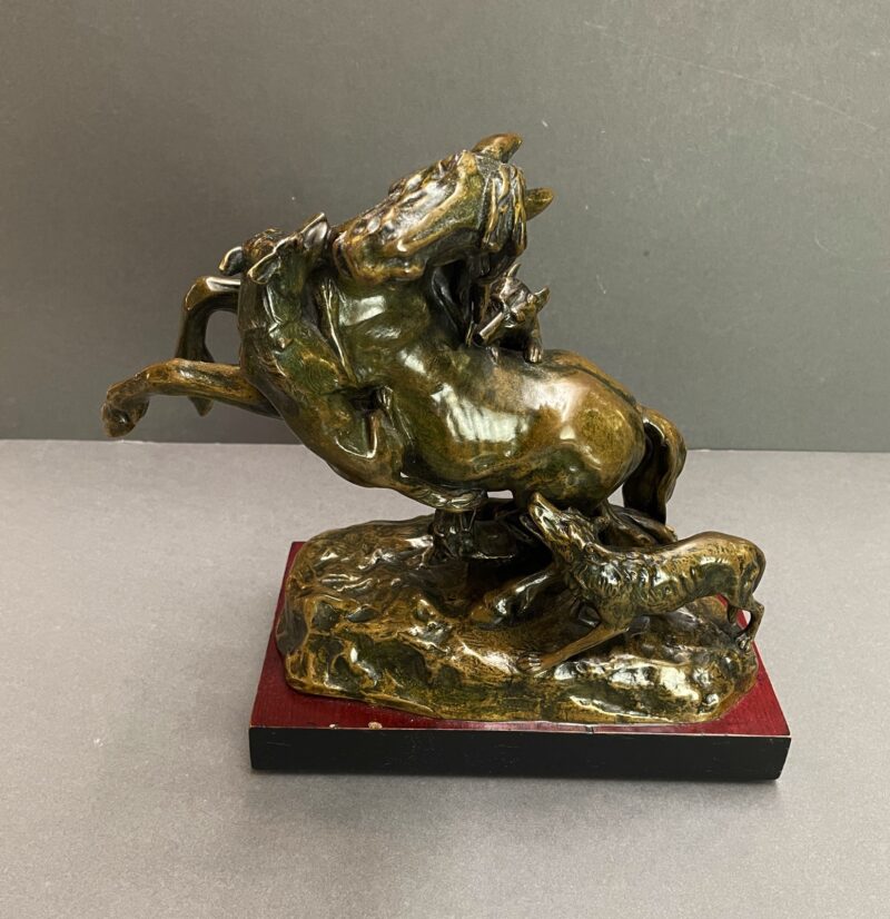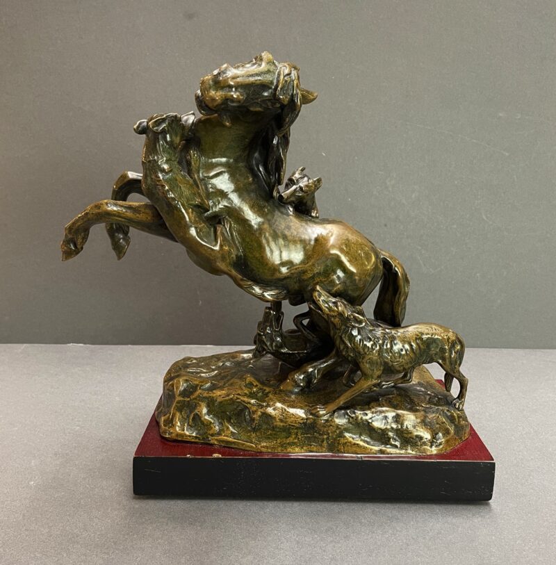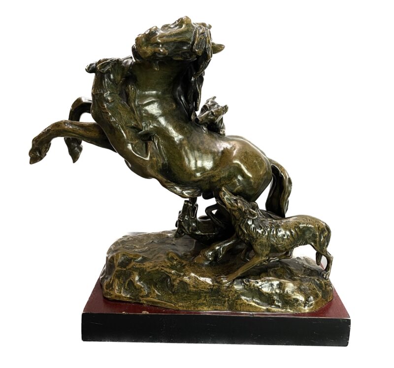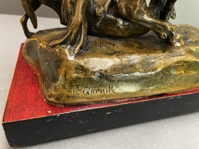 A animal figural grouping of a horse being attacked by 3 wolves – after Freiderich Gornik (active 1877-1943).  The horse is rearing on it’s hind legs as it is being attacked by the wolves.  The bronze sits on a rectangular wooden base.  The patina of the bronze is in a slight green/brown patina.