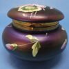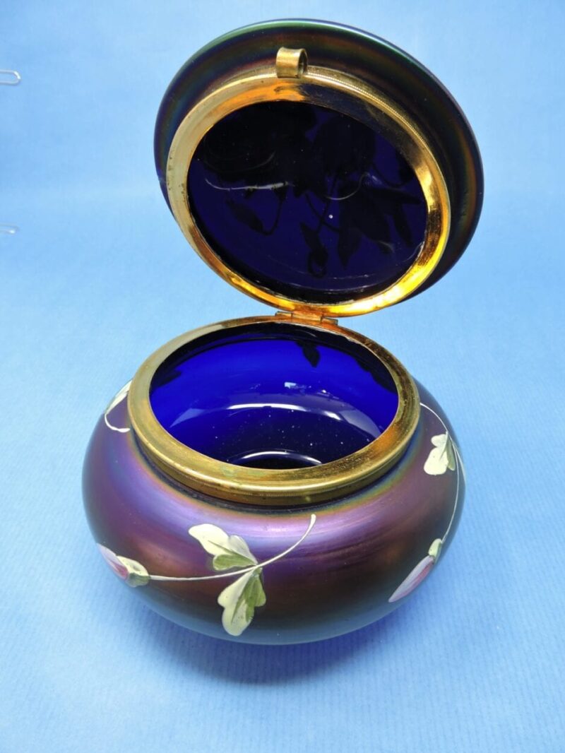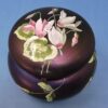 Here is a wonderful Austrian purple iridescent glass dresser box with brass hinged lid and closure. The box is decorated with enamelled flowers in pinks and white with enamelled leaves in two shades of green.