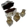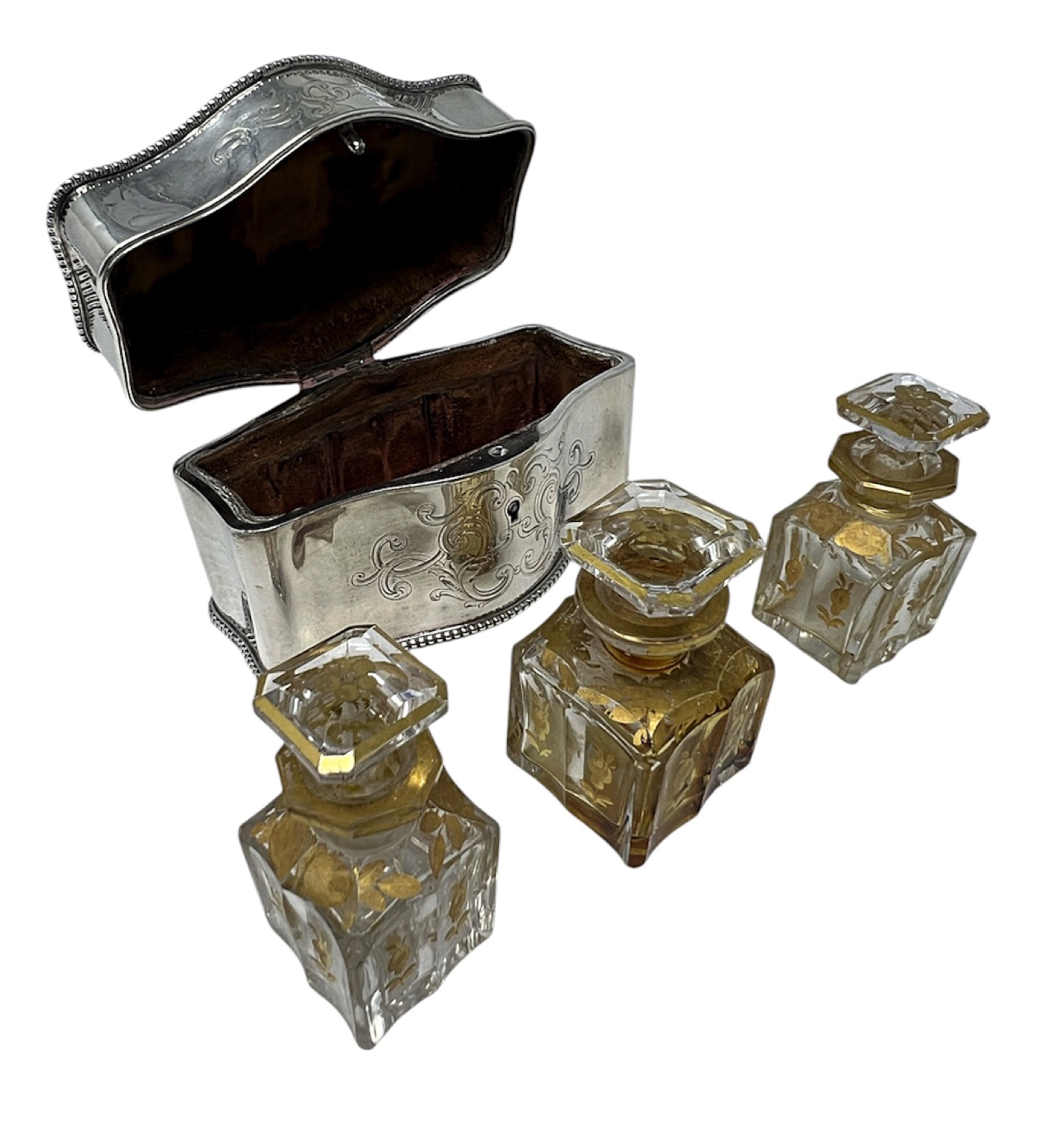 Rare Continental Austro-Hungarian .800 Sterling Silver Perfume Box Set of 3 Bohemian Crystal Gilt Perfumes, Circa 1867-1872