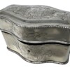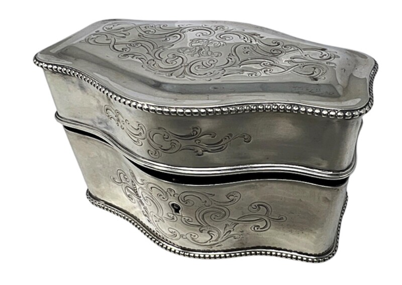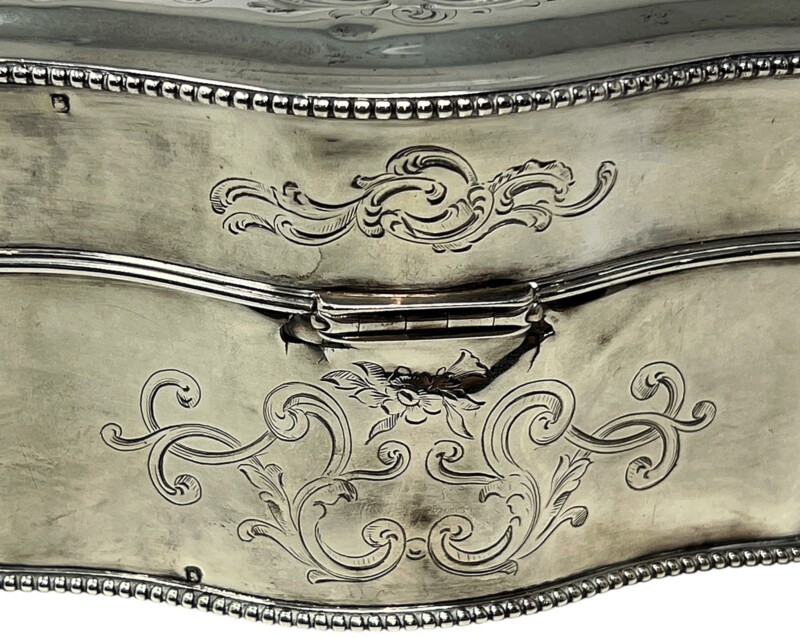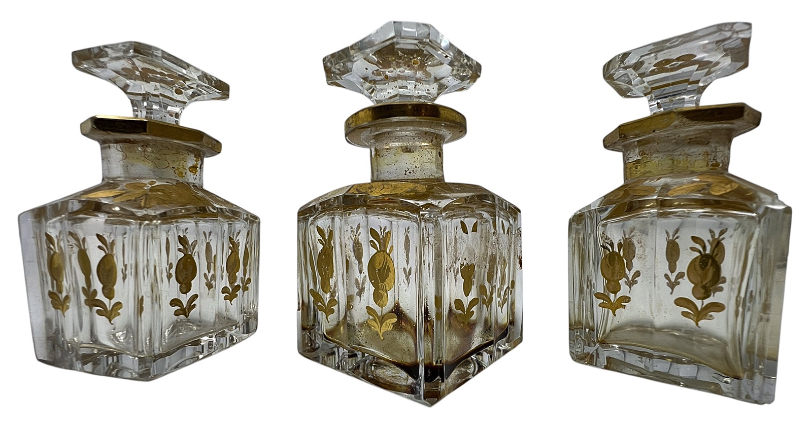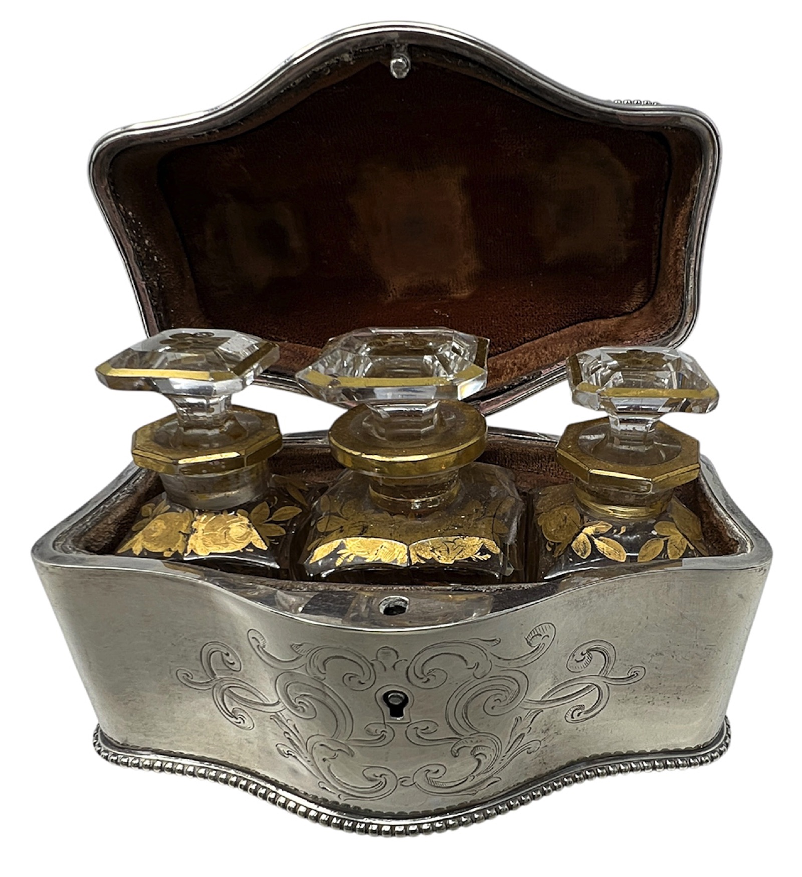 The exterior is masterfully hand-engraved with floral scrollwork and a beaded border, retaining its original lock. Housed inside are three cut-crystal bottles in a graduated arrangement, each adorned with hand-applied, gold-encrusted rose motifs and faceted geometric stoppers. Finished with gold-washed silver collars, this trio was designed as a “perfume cellar” for a prestigious vanity or high-end travel set. It remains a sophisticated display piece for collectors of Continental silver and fine Bohemian-style glass.