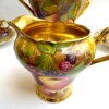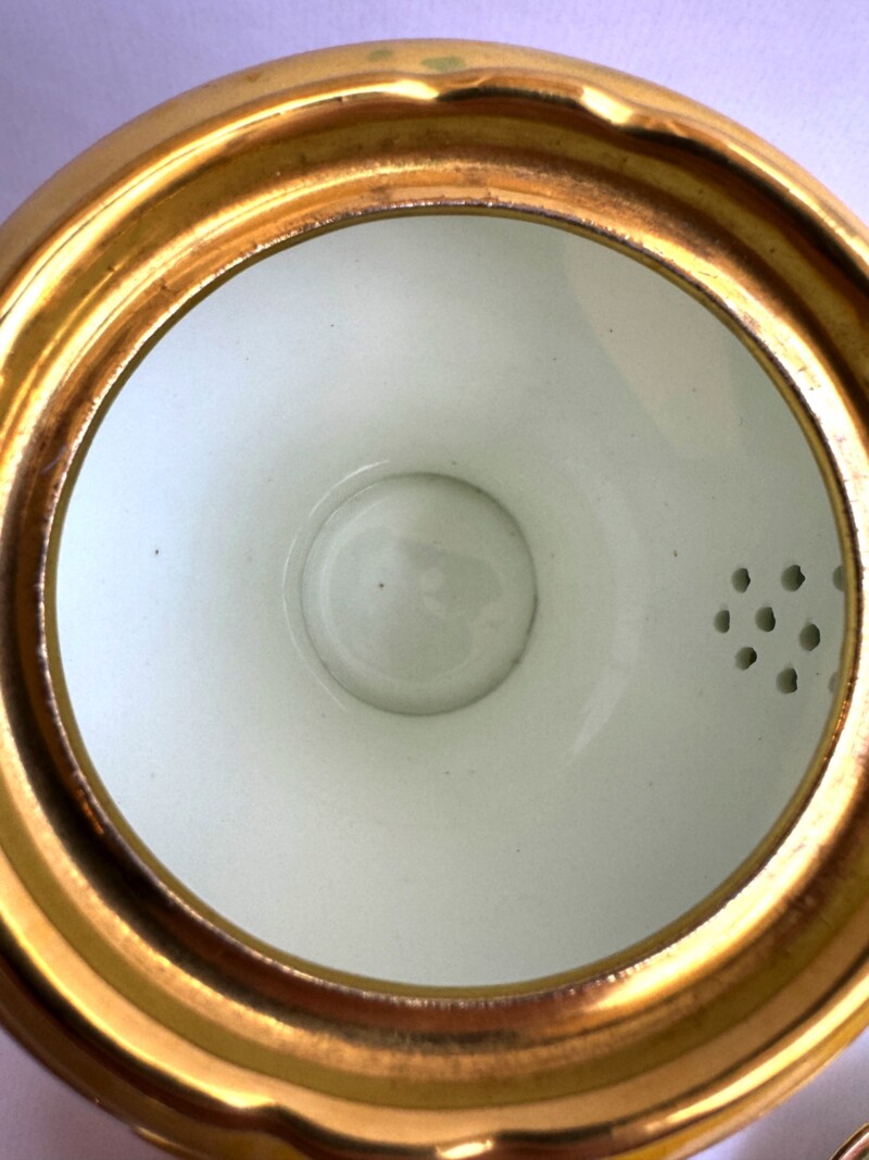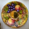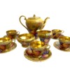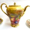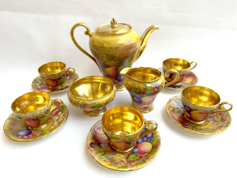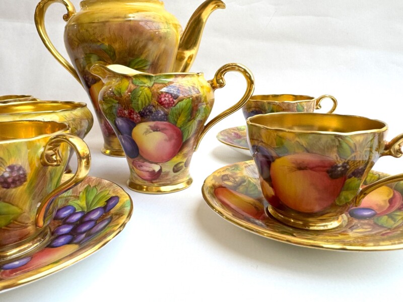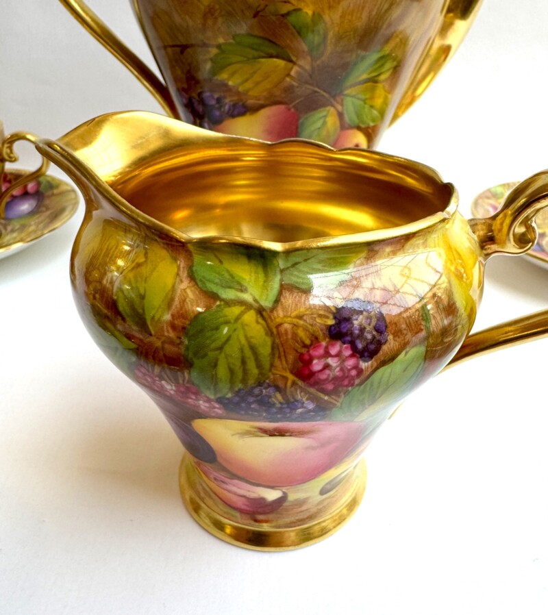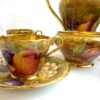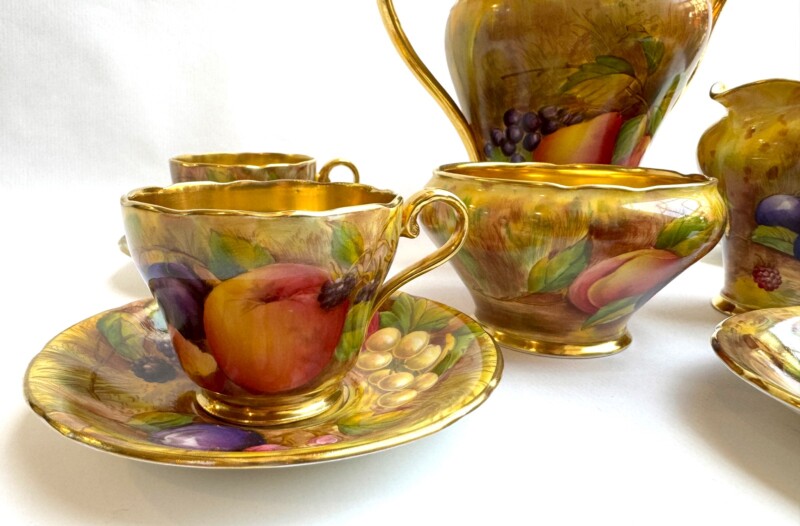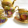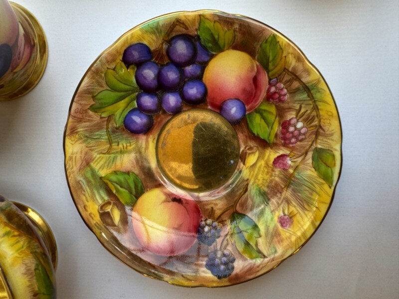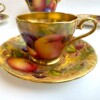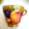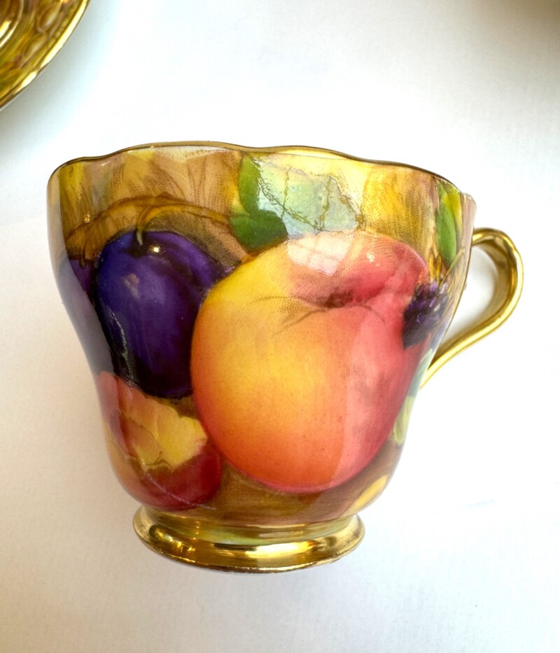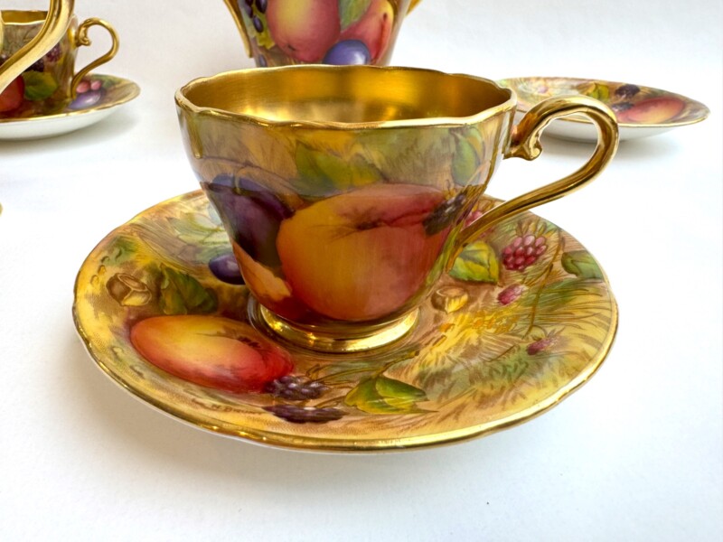 A charming “Aynsley Orchard” demitasse set. Each cup and saucer is beautifully hand-painted with fruit and features a richly gilded interior.