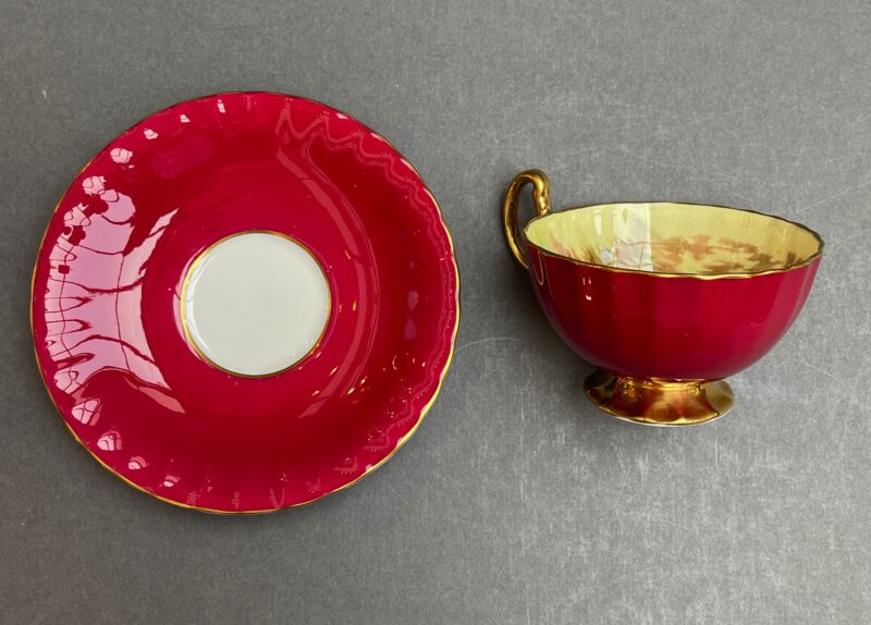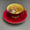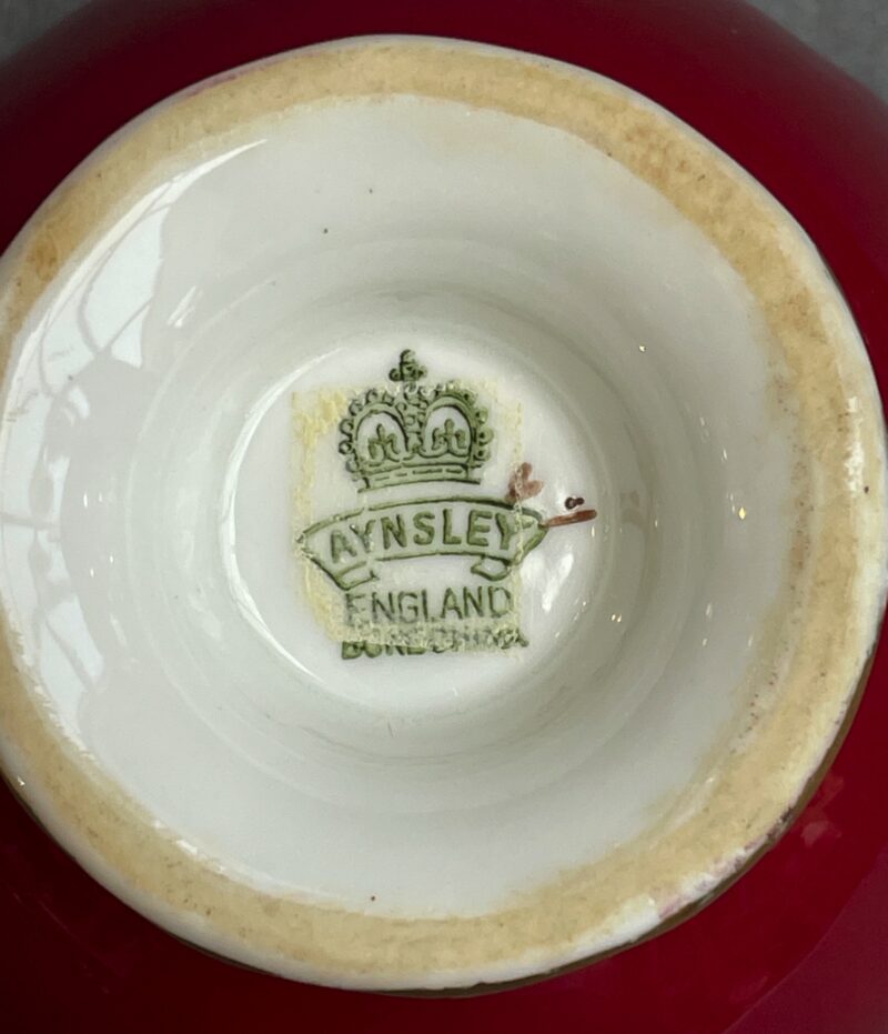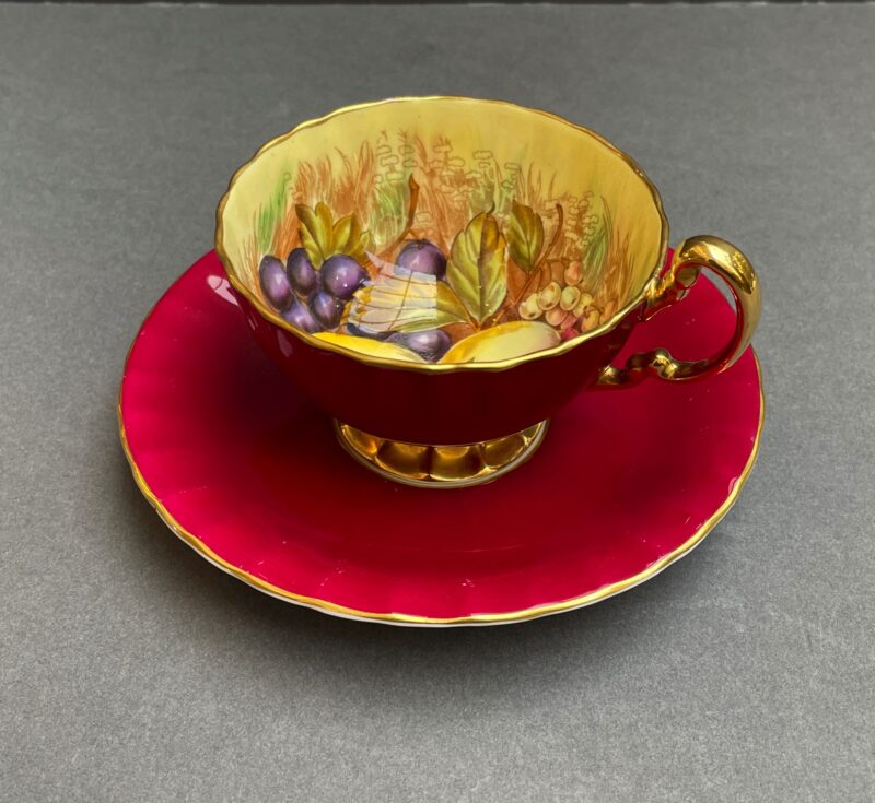 Aynsley Orchard Fruit Cup & Saucer in Red #1 – Gold Foot & Ribbed Body – Signed D. Jones