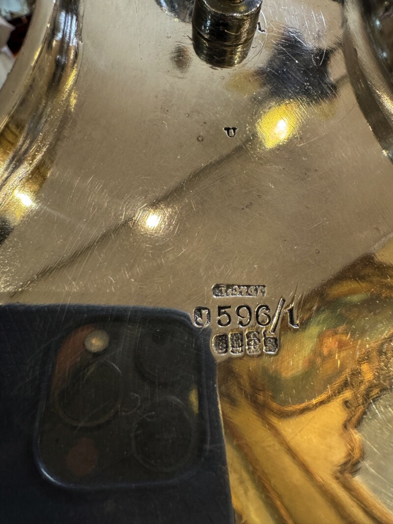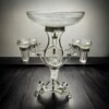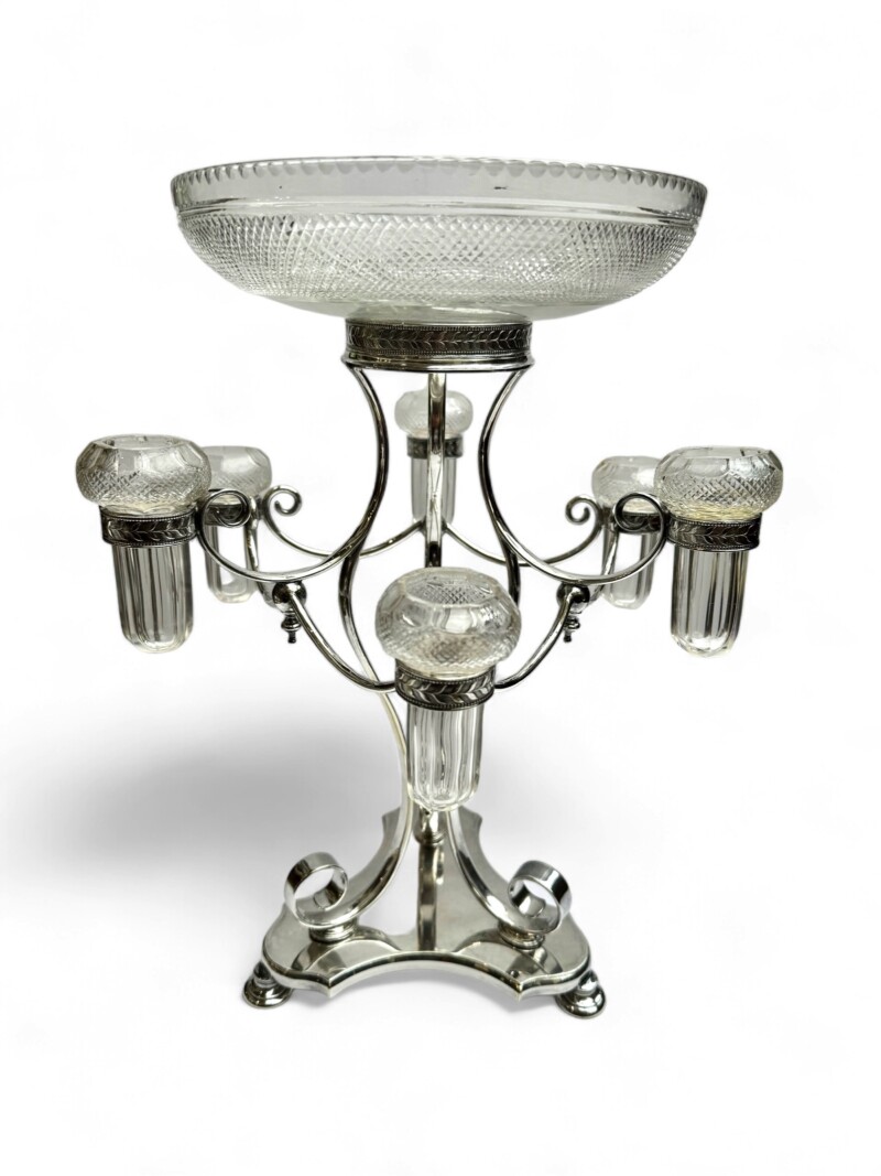 Art Glass / Crystal, Silver HollowareA rare late Victorian “epergne” by J.D & Co Ltd, out of Birmingham England circa 1898 . An epergne is an ornamental centerpiece for either a dining or coffee table, typically used for holding sweets and flowers. This epergne has a cut crystal bowl in the center with six arms coming out to hold six crystal flutes. The flutes are removable and “vase like” for holding flowers. Owing to the age 2 flutes have small imperfections which are not visibly noticeable & do not affect the function. The tiered effect of the upper crystal bowl and lower similar cut crystal flutes rise up from a triangular silver plate base. A gorgeous elegant piece from a most famous historical British family dedicated to the finest quality and throughout the 19th century rose to become one of the major manufacturers in their field.