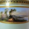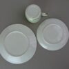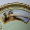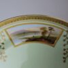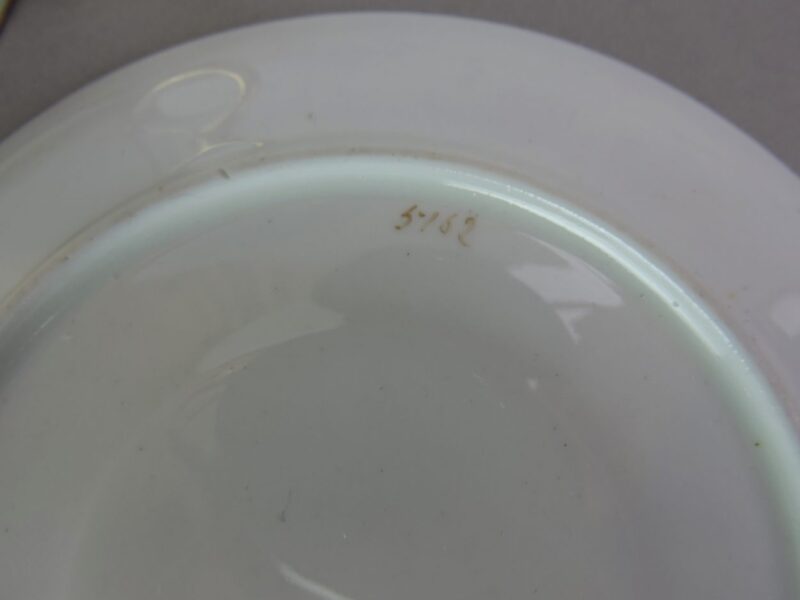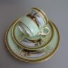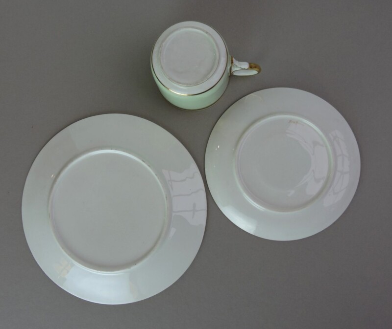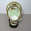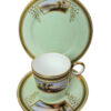 A beautiful hand-painted porcelain trio, consisting of a cup, saucer and under-plate. The set is painted a soft green and shows a scenic riverside view on each piece. It is unsigned but is numbered “5762” on the underside of the saucer.