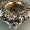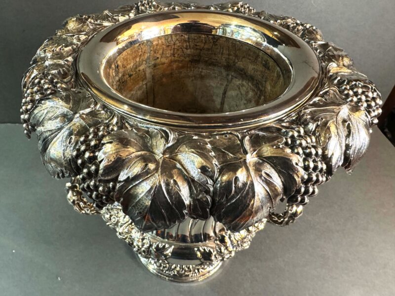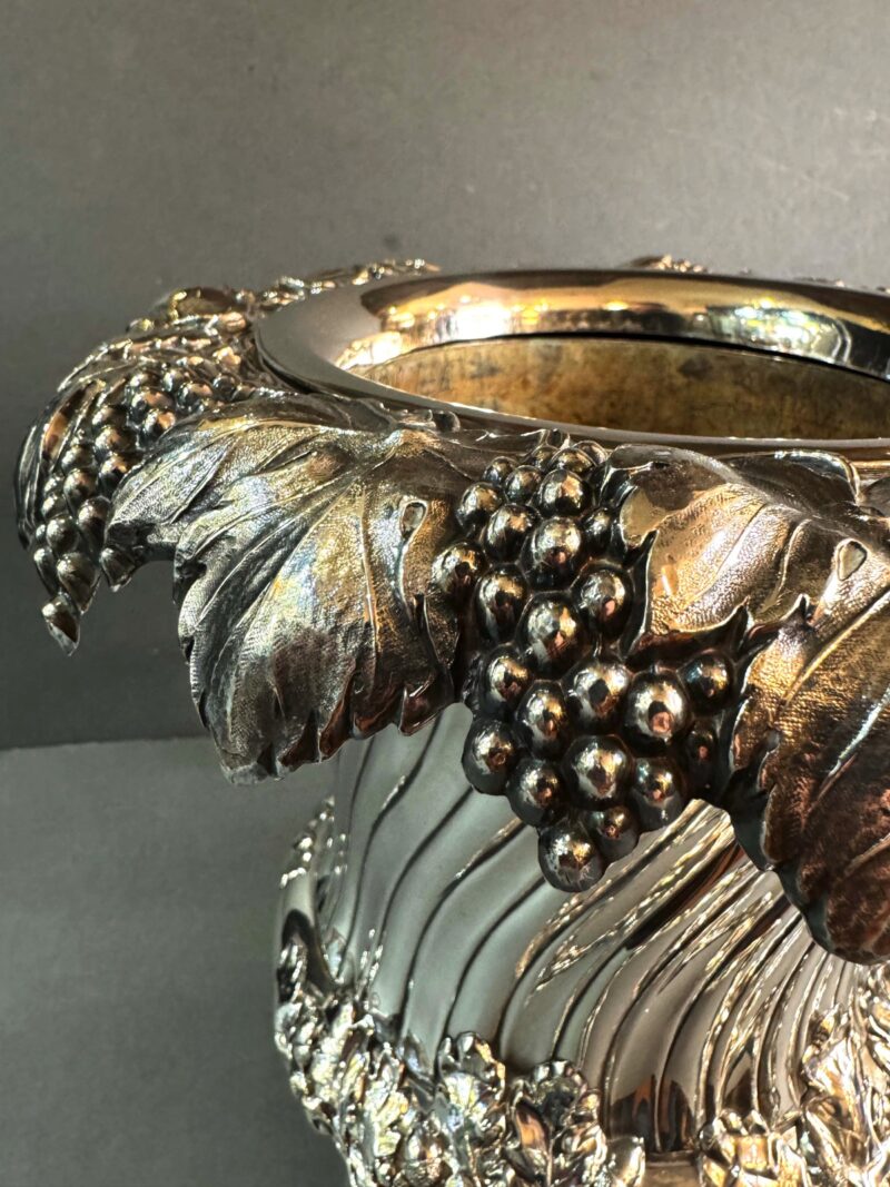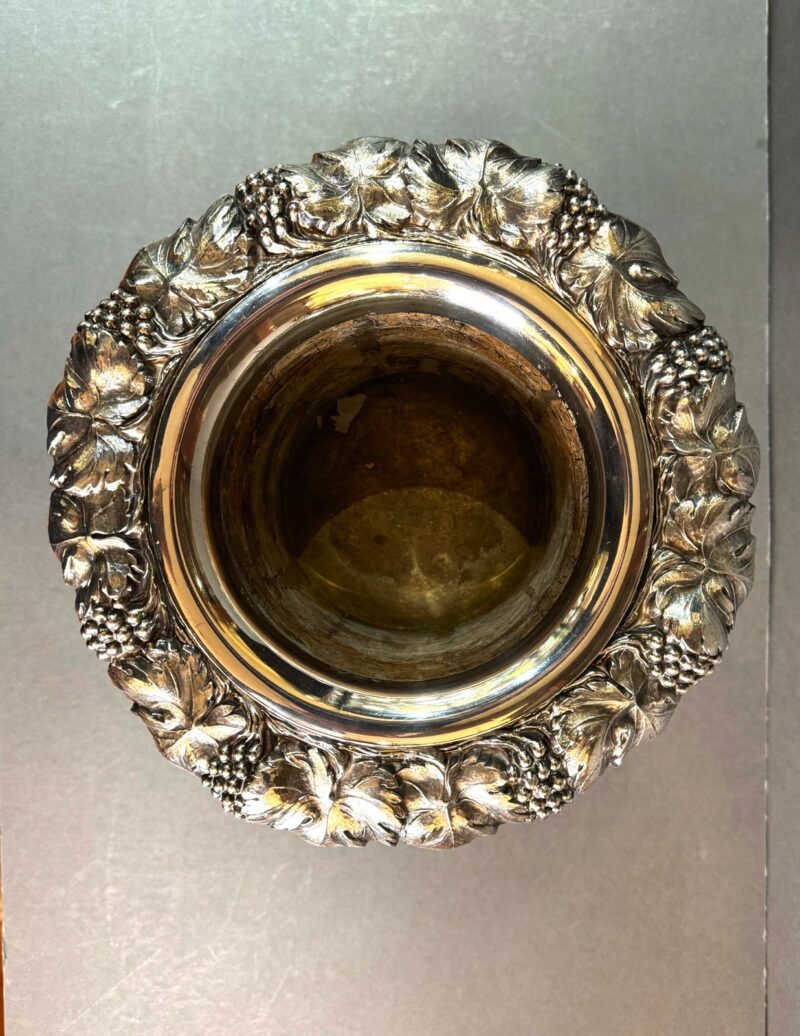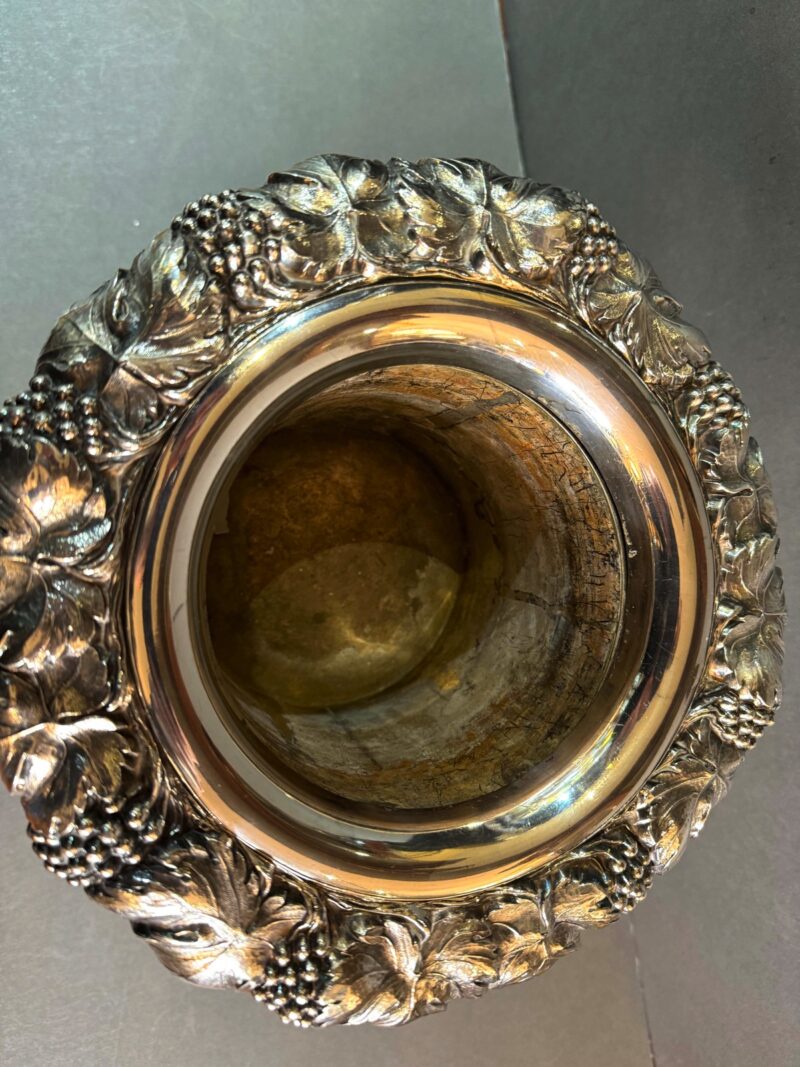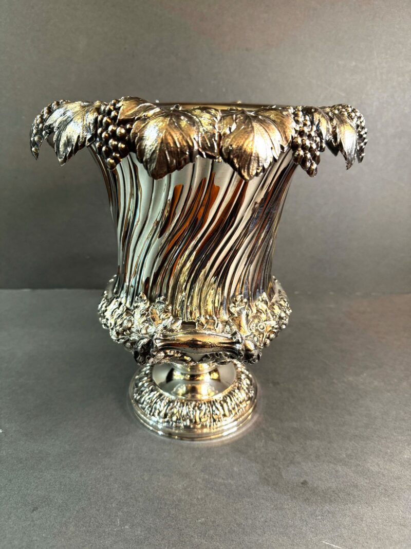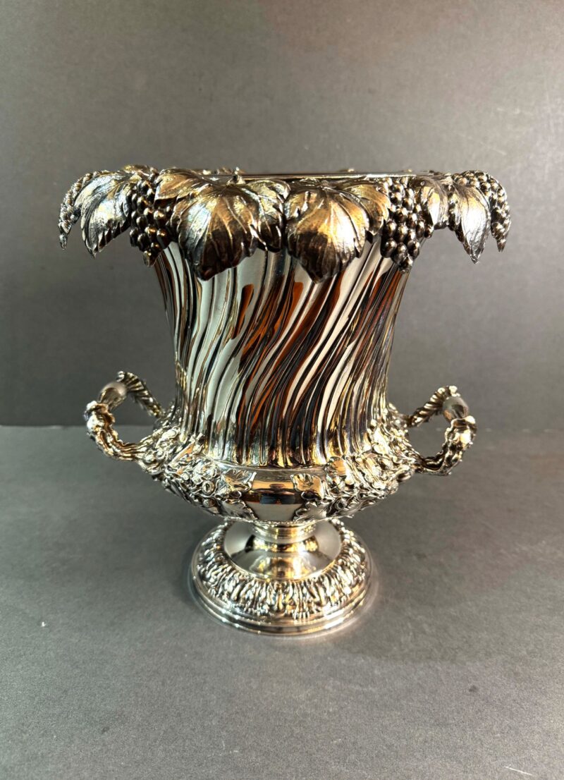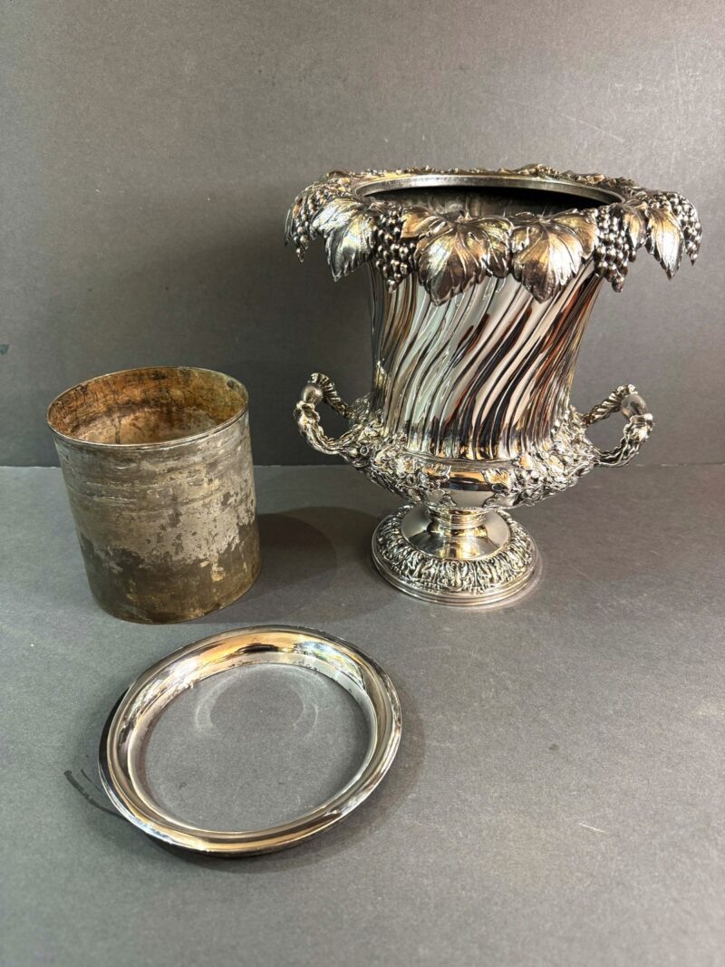 A beautiful quality Old Sheffield plated wine cooler with removable liner and collar in a Campana form.  The cooler is decorated with a grape and leaf rim that overhangs the body.  The body is decorated with a slight twist down to a bulbous centre with two handles all decorated with acorns and leaves.  The interior is tin lined and the liner is removable as well as the collar in order to place ice between the body and the liner to keep the wine or champagne cool.