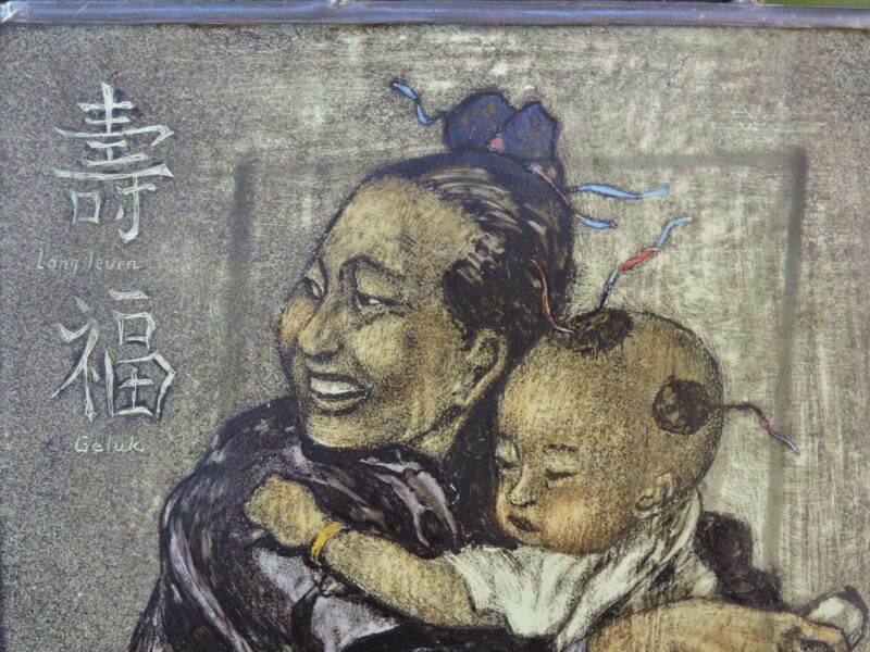 Belgian Painted Stained Glass Panel – Asian Woman & Child, Artist: M. Van Coppenolle (1912-2004)