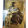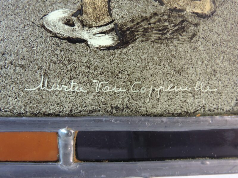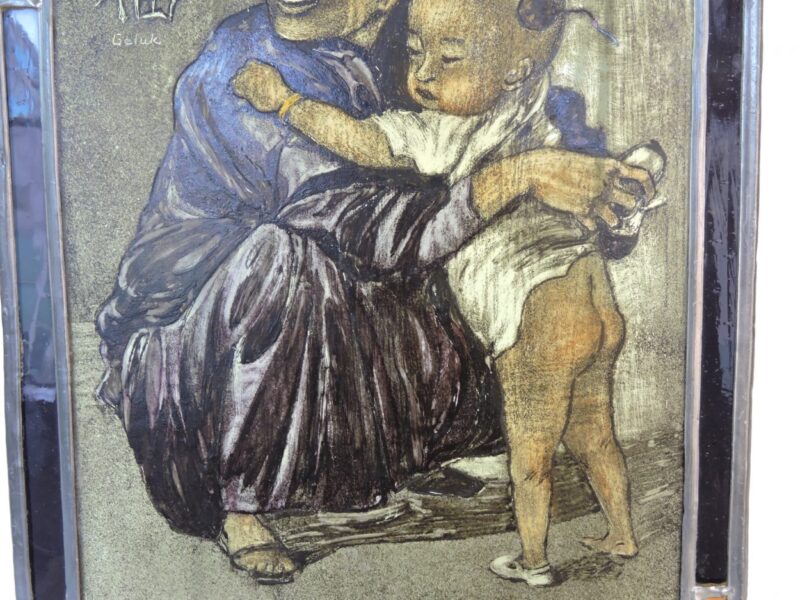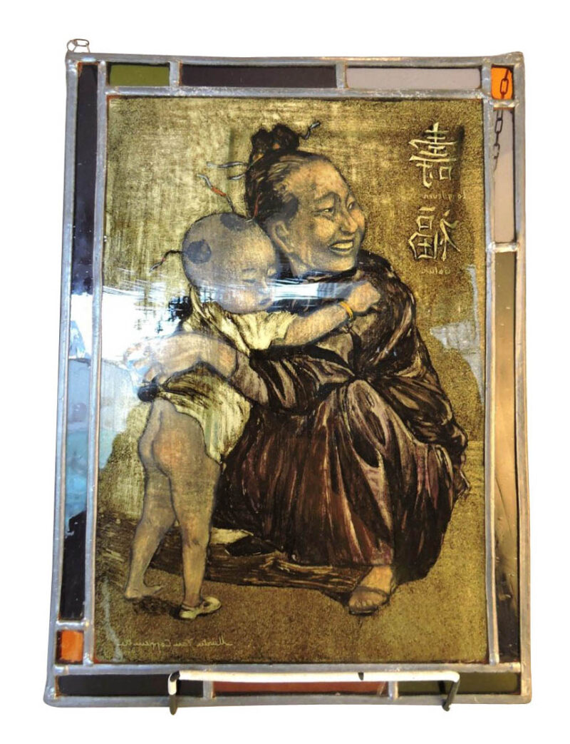 v** SOLD ARCHIVES **vA wonderful stained glass panel of an Asian woman and child, painted and signed in the lower right corner by the Belgian artist, Marta Van Coppenolle (b. 1912 – d. 2004)