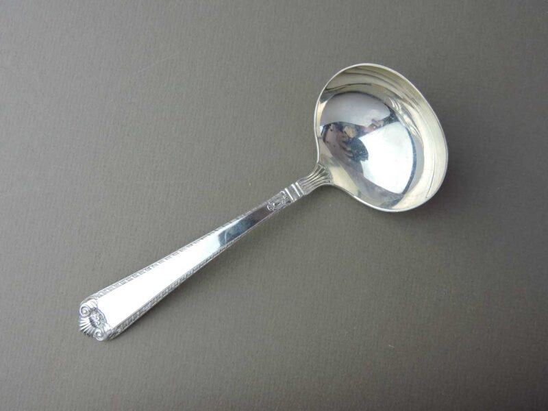 A sauce or gravy sized ladle in the George II plain pattern by Birks.  This was one of Birks’ top patterns.  Heavy thick silver.  Beautiful quality.