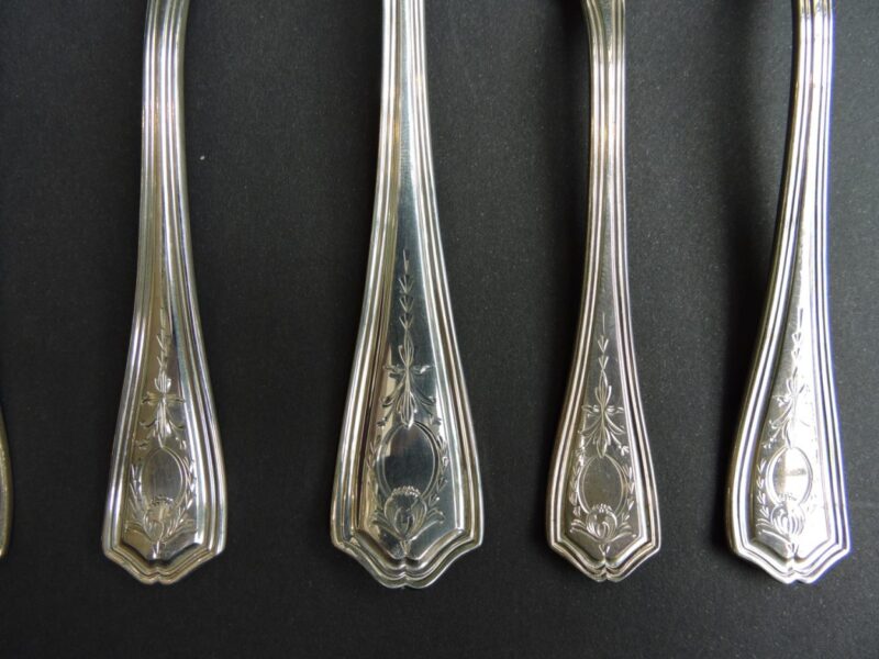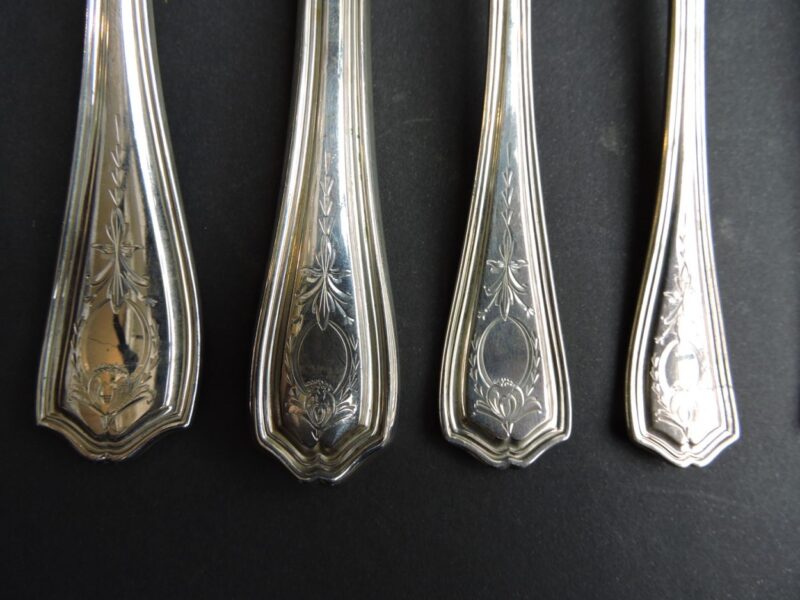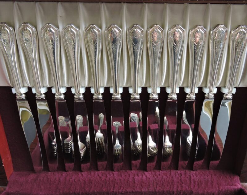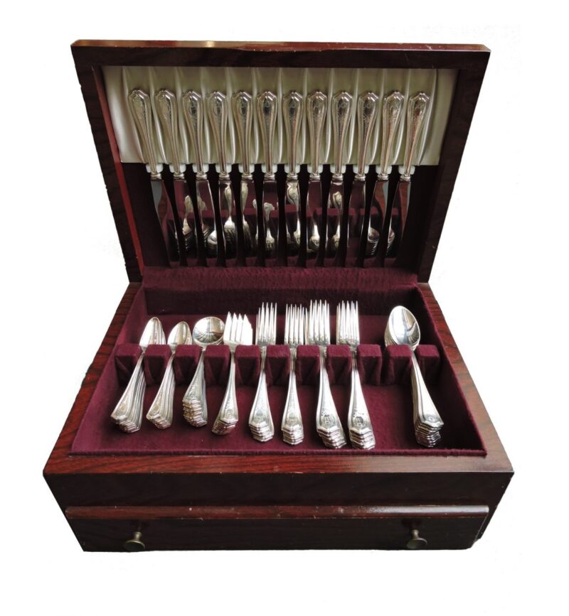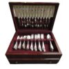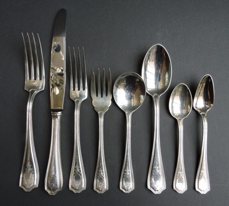 A beautiful quality sterling silver set in the ‘Georgian Engraved’ pattern by Birks.  The set consists of 8 pieces per place setting.  There are 12 place settings = 96 pieces.