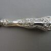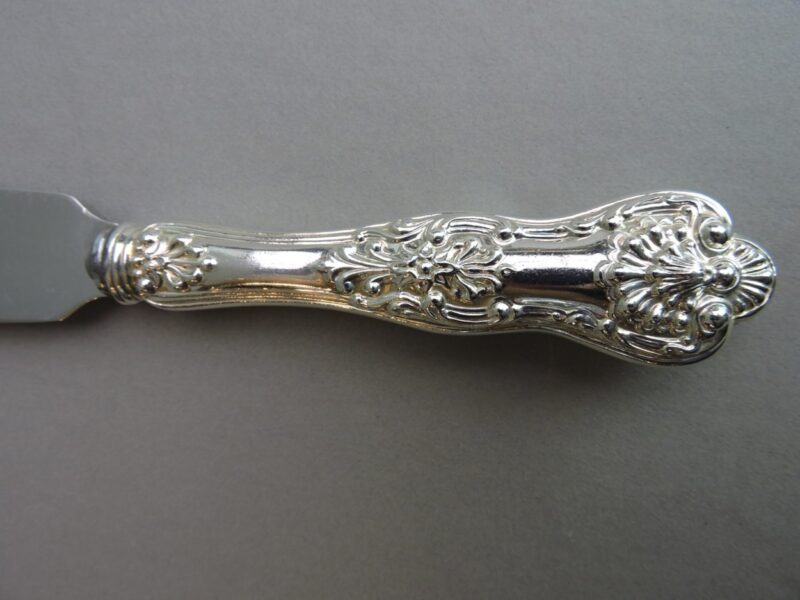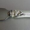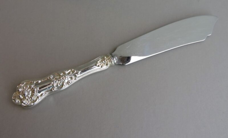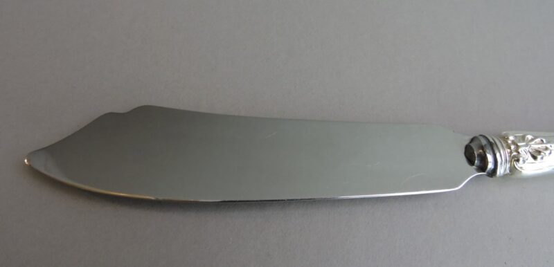 A very pretty Birks Sterling cake knife in the Queen’s Pattern. The knife is stamped “Birks Sterling” on the underside of the handle and “Stainless” on the blade.