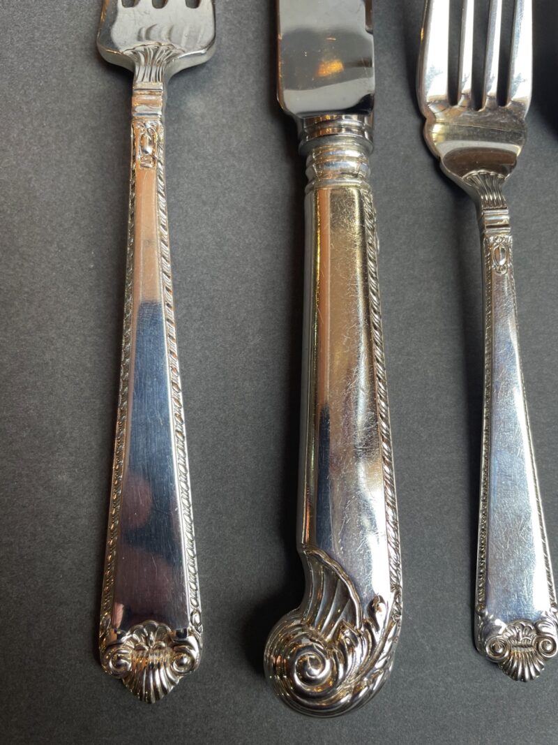 “George II Plain” – Birks Sterling Dinner Set for 12 + Serving Pieces – with Pistol Knife Handles – 90 Pieces