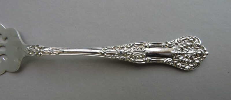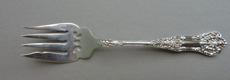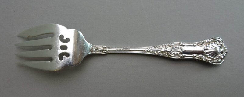 A beautiful Birks Sterling silver meat fork in the Queens pattern.  The underside of the handle is stamped “Birks Sterling”.