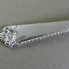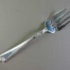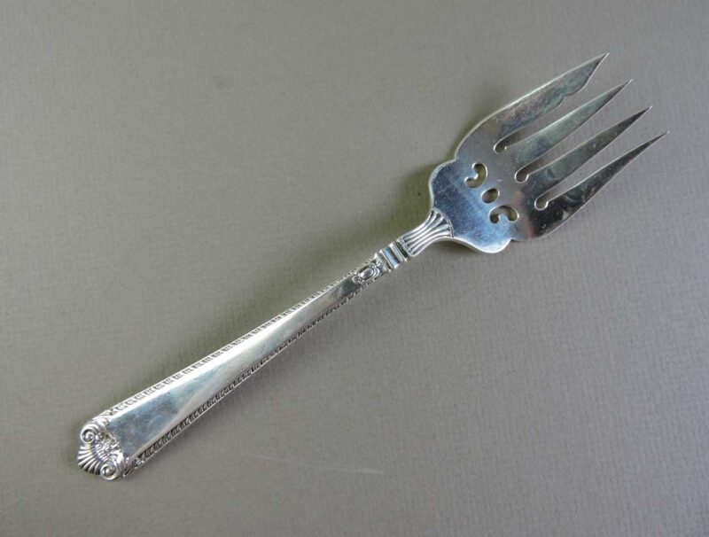 A serving fork by Birks Sterling, it dates mid 20th century. It has a beautiful shell, scroll,ribbon and floral pattern upon front, with heavy accent at the end of the handle and centre. The body is rather smooth with rounded edges, it has unique saxon pierced marks in the centre near the points.