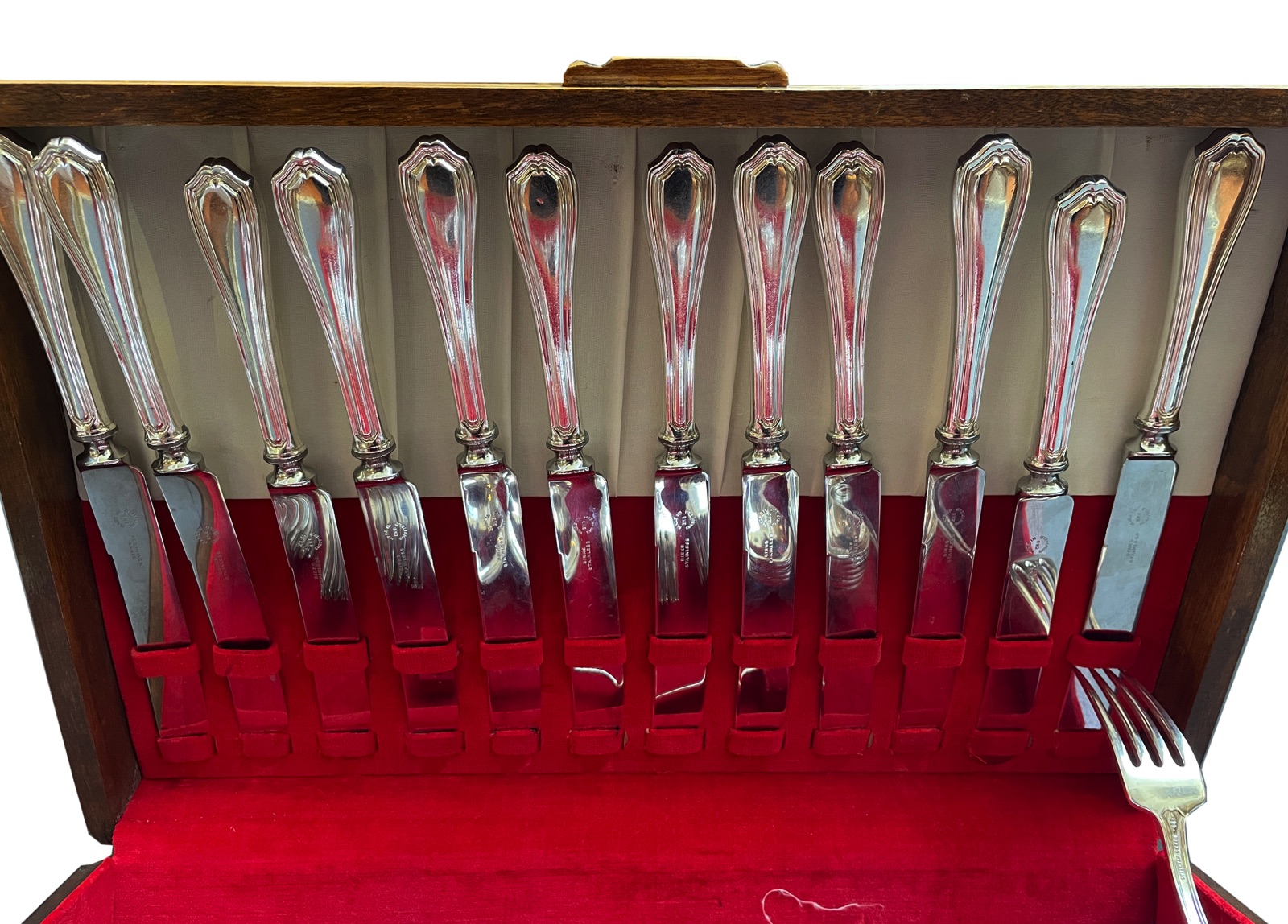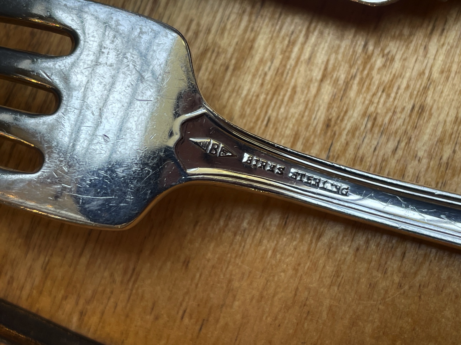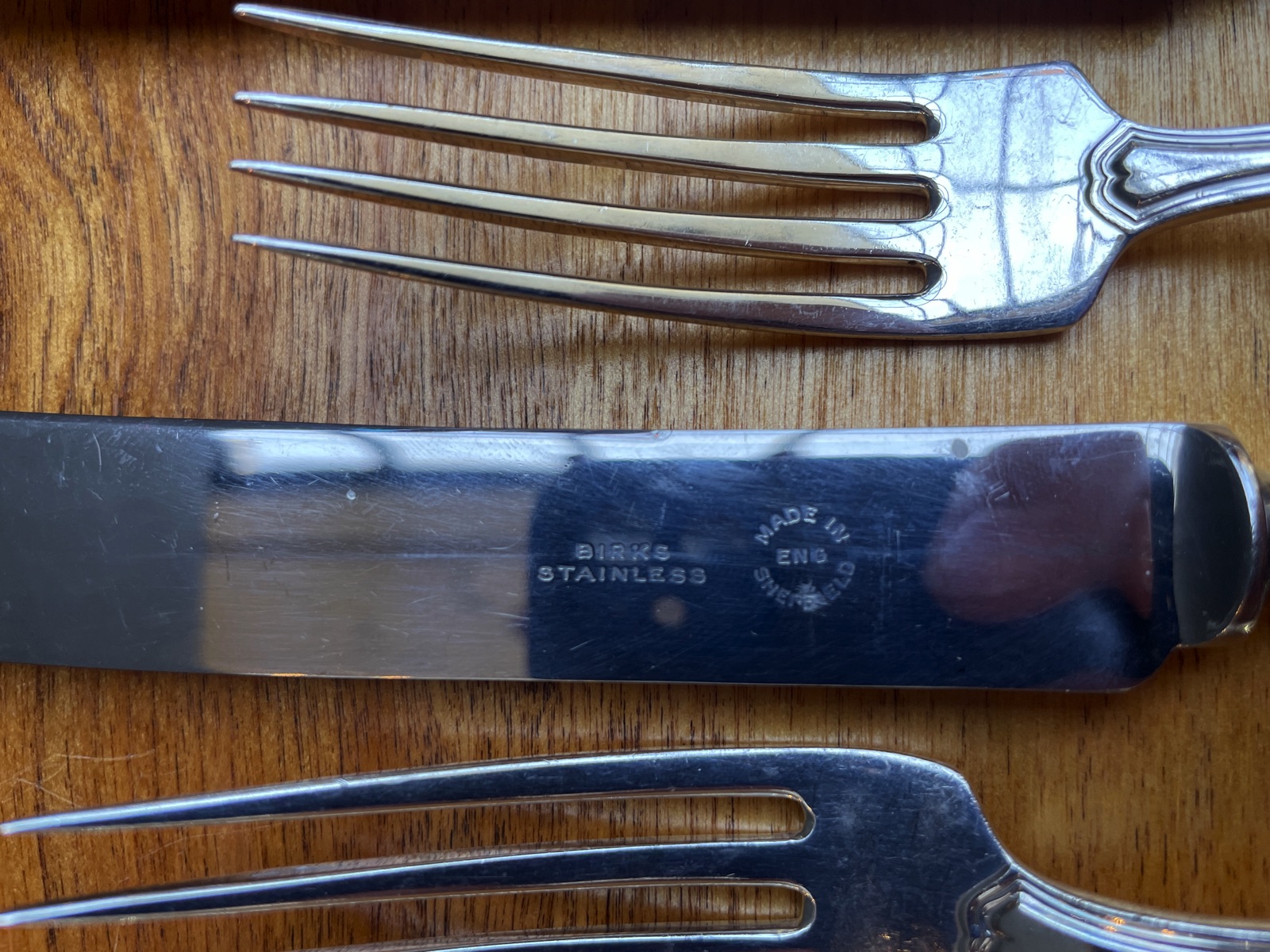 Silver Flatware SetsA beautiful and complete set of Georgian Plain by Birks. Early paddle shaped stainless blades and early Birks sterling mark date this set circa 1910-1920.