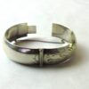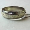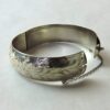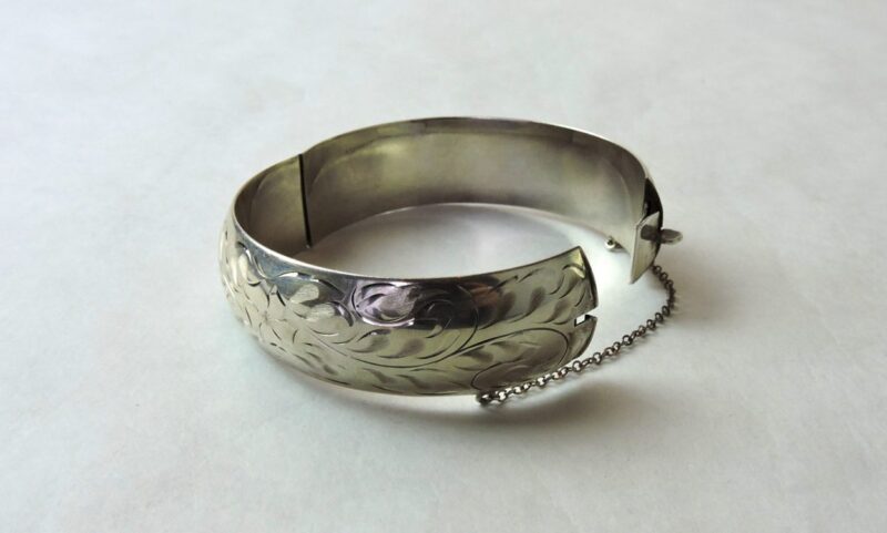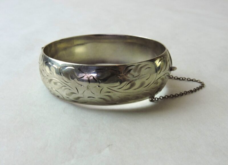 Here is a beautiful sterling silver hinged cuff bracelet, with a slide closure that closes tightly and an attached safety chain. It is signed “sterling” and shows the Birks mark on the inside of the cuff. The bracelet is engraved on the front half with flowers and stylized leaves. The bracelet is 3/4 of an inch wide and is in good condition with just minor surface wear. There are no dings or dents.