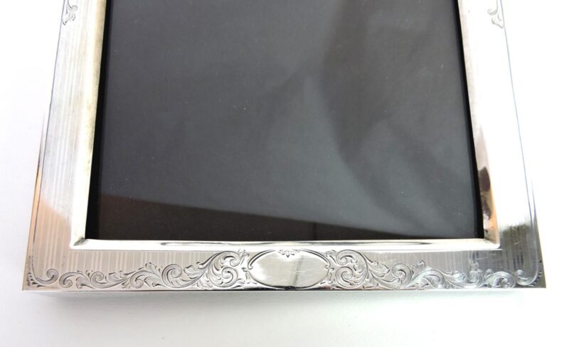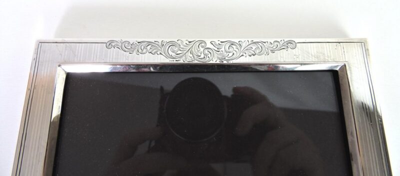 Here is a lovely Birks sterling silver table photo frame with black backing, circa 1915. The frame is decorated with swirls and scrolls and is very attractive. It is stamped “Birks Sterling” on the top of the frame.