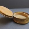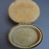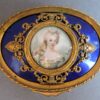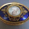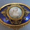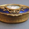 A beautiful oval dresser box with blue enamel and decorative ormolu. In the centre of the hinged lid is a painted portrait of a woman. The portrait is signed “Pauling” on the lower right side.