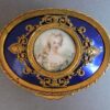 Blue Enamel and Ormolu Oval Dresser Box with Hinged Lid, Painted Portrait of a Woman, signed “Pauling”
