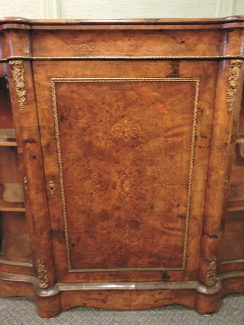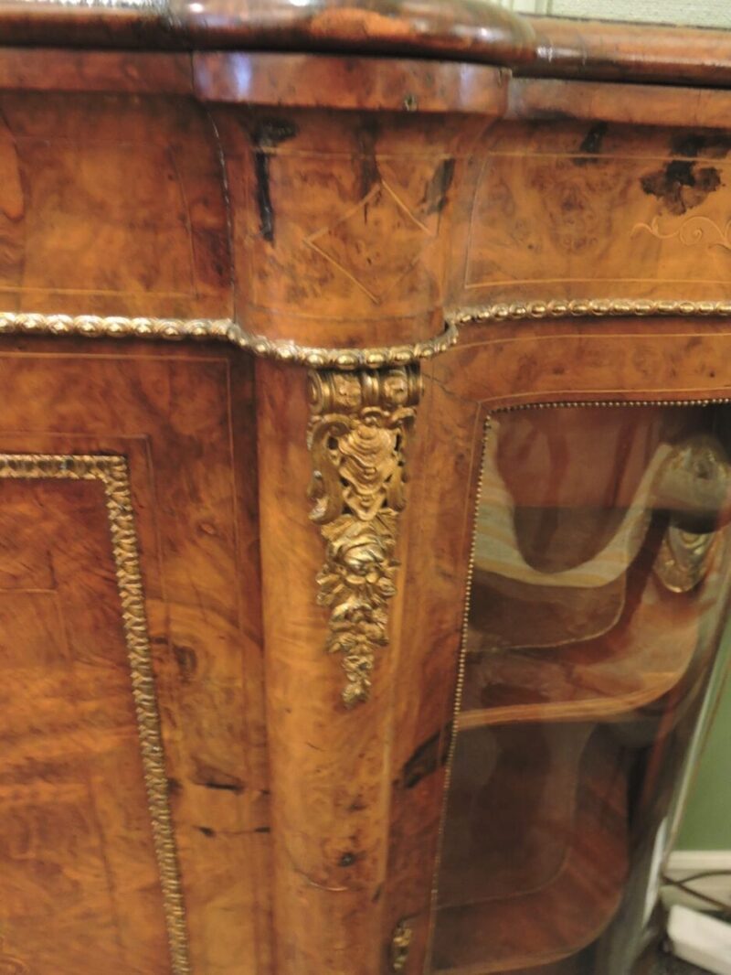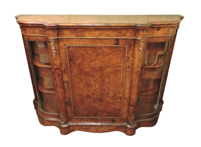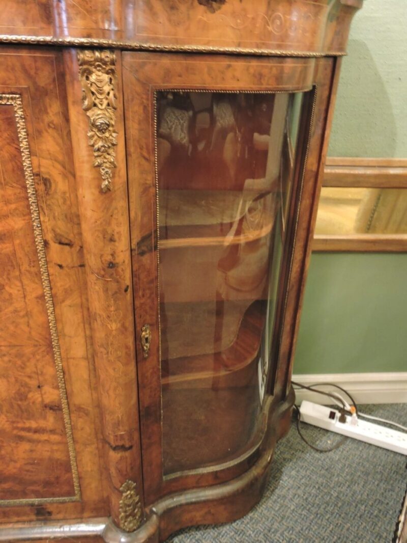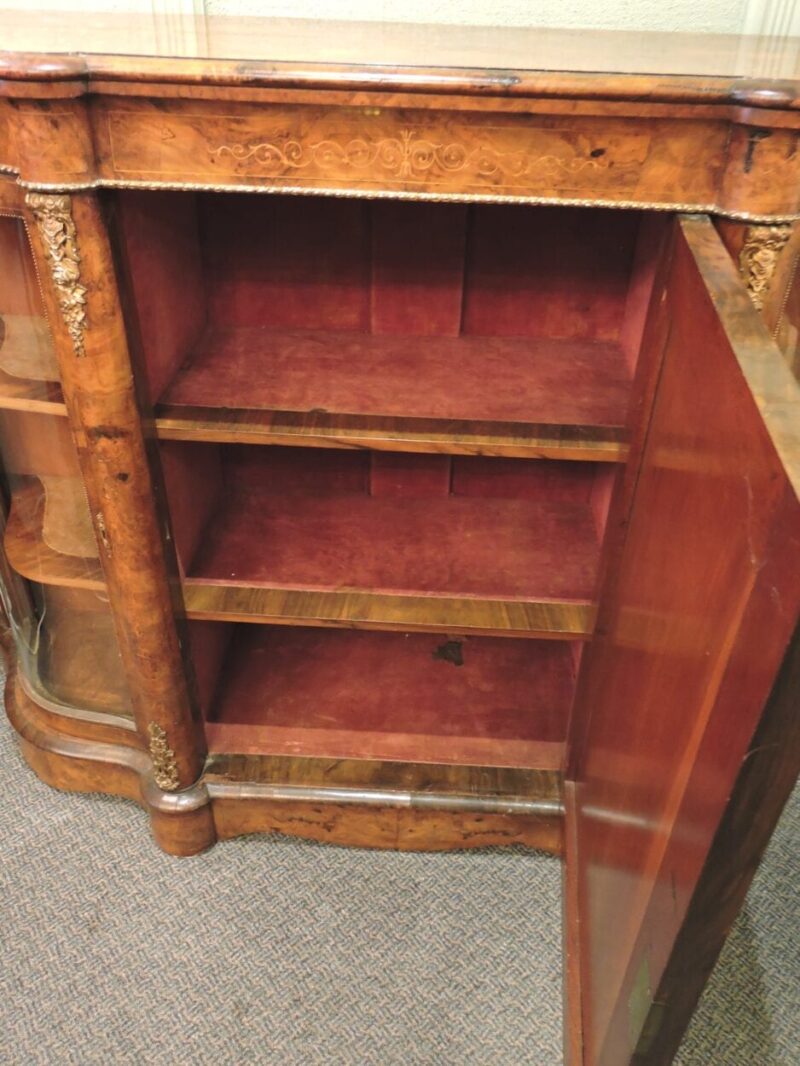 Burled Walnut English Victorian Credenza with Curved Glass Sides – circa 1860
