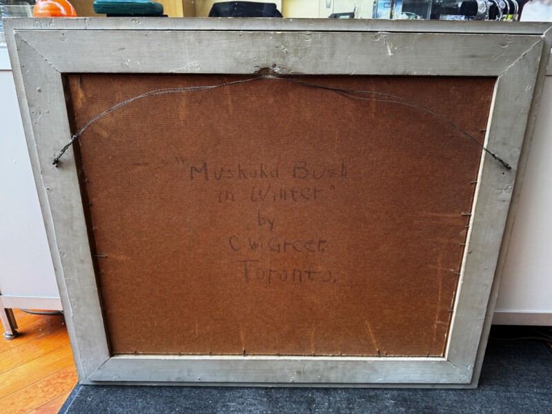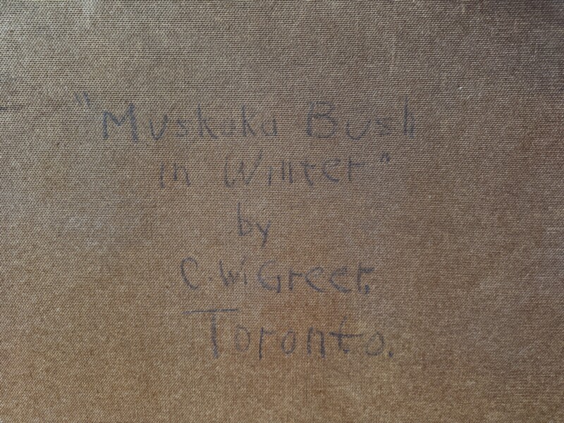 Presented here, “Muskoka Bush in Winter” depicts a beautiful sun lite winter scene, painted in a similar style to the Group of Seven member Frank (Franz) Johnston. The gorgeous sun lite snow in the foreground shows tremendous movement in the brushwork where you can feel the light “dancing” on the cold snow. This is a large work so it is unlikely that he painted it “En Plein Air” in winter but you never know because he usually did all his work outdoors similar to the onsite techniques of the Group of Seven. The painting is signed front lower left “Clifton Greer” in red and the title and name is written in pencil on the back. The generous handsome frame is in keeping with the time period of the work.