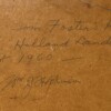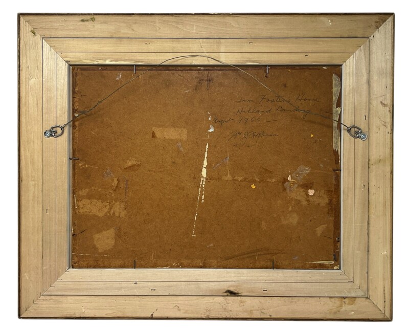 Hopkinson was known to travel into the dense forests of the Haliburton area and paint on location or “en plein air” using palette knives and laying on thick layers of oil paint. “Tom Foster’s Home Holland Landing” the subject of this painting, was likely done “en plein air” and is in keeping with his rich application of sophisticated, intensely contrasting tones that give an overall feeling of the ruggedness and drama of the landscape around him. Signed on the reverse: “Tom Foster’s Home Holland Landing , August 1960 W J Hopkinson”. The guilt frame and linen matt are in good condition.