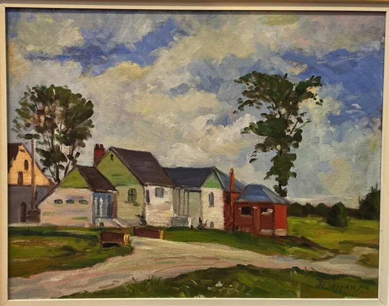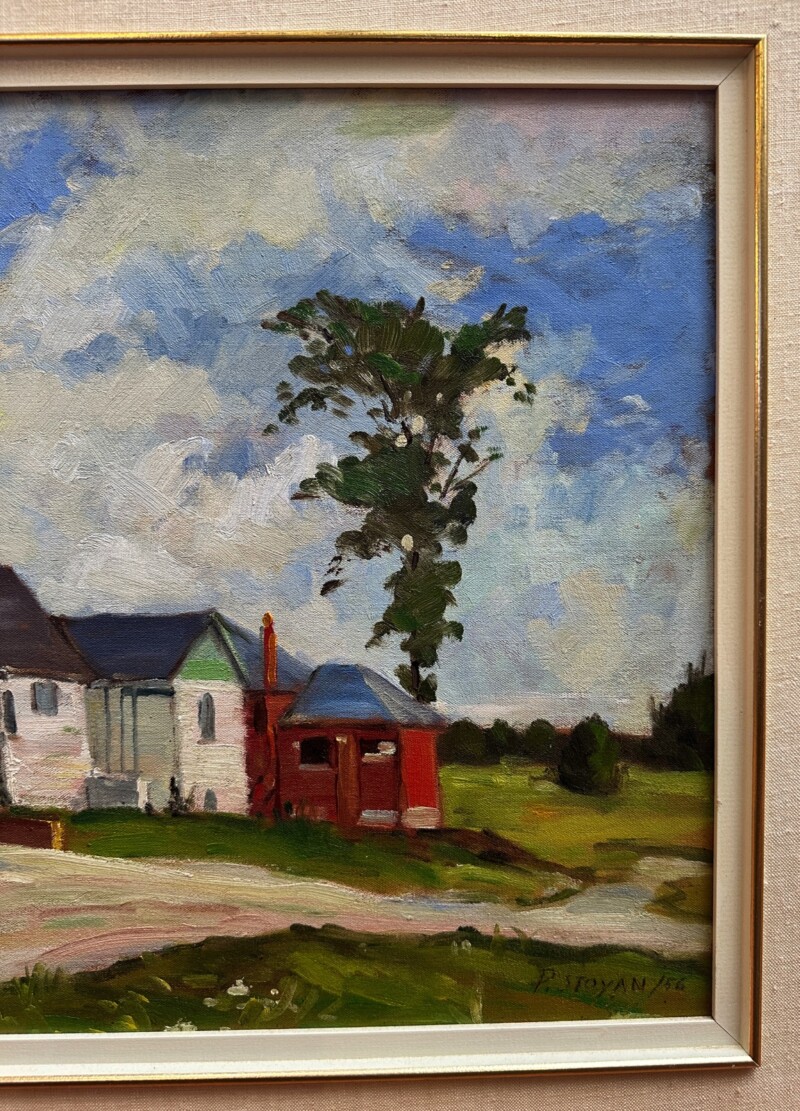 ArtAn oil on masonite work, “Cottages” depicts a view of small houses or cottages near Bracebridge Ontario on a sunny summer day in a sophisticated colour palette by Peter Stoyan (né Stoyanoff ) a Greek/Canadian painter (1900-1979). Stoyan emigrated to Canada in 1914 and studied art in Toronto at the Ontario College of Art, under George Reid, J. W. Beatty, Fred Haines and Arthur Lismer.