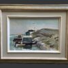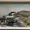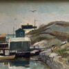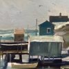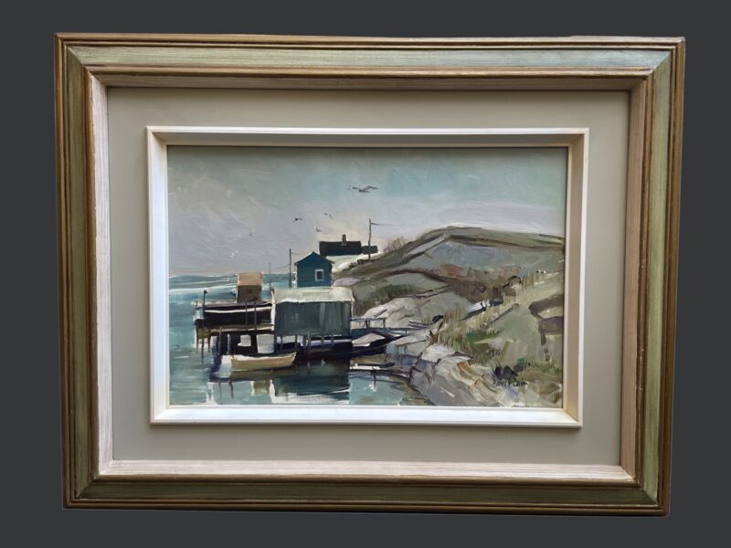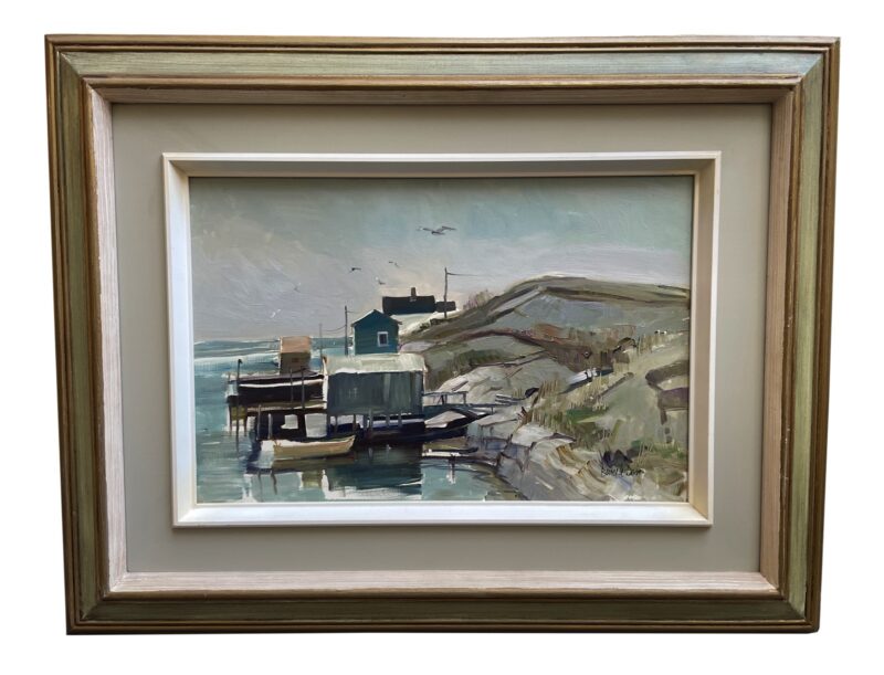 An oil painting on panel by Canadian artist Bruce Le Dain (1928-2000).  Titled “Blue Rocks, Nova Scotia” – the painting is in a typical Le Dain colour palette.  The scene is covered docks on a rocky shore with boats on water.