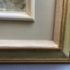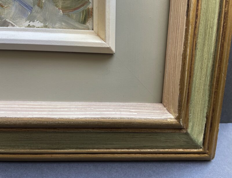 Framed in a grey/green wood frame with gold trim.