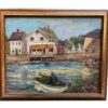v** SOLD ARCHIVES **vA lovely bright and colourful oil painting on board of a harbour scene with houses along the shoreline and a man in a row boat heading out to sea.