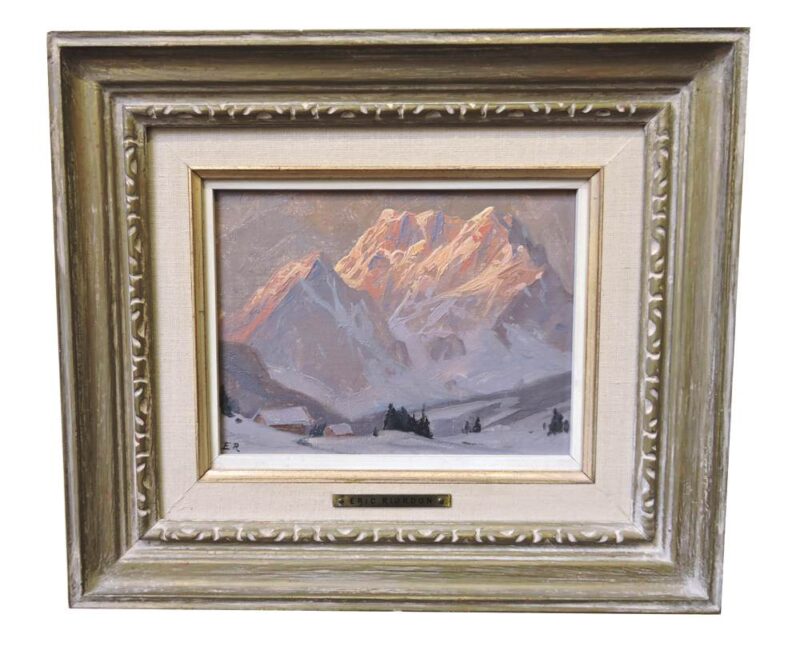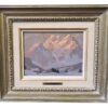 v** SOLD ARCHIVES **vA Western Canada mountain winter scene – oil on board by Eric Riordon (b. 1906 – d. 1948). Painting is titled “Sunset” as the sun is setting on the mountains and giving a pink/red glow.