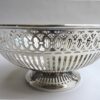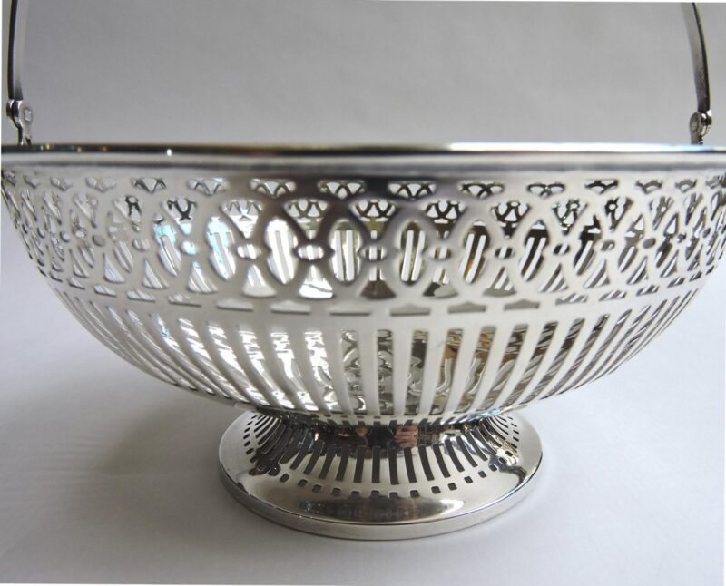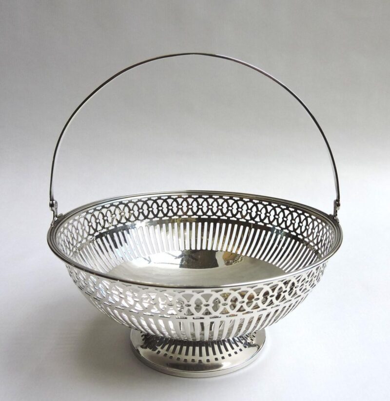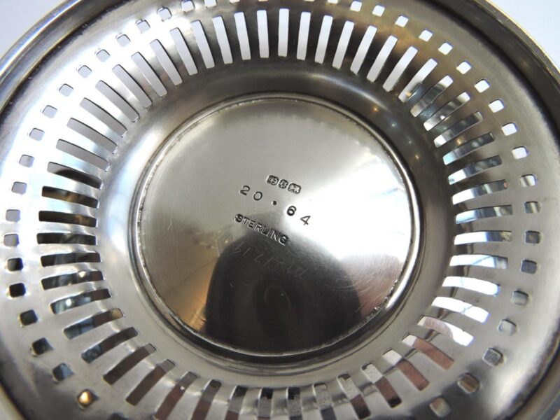 The basket has a pierced body and base and is monogrammed “M” on the inside bottom of the basket. It is signed “sterling” with hallmarks and the numbers “20.64” on the underside of the base.