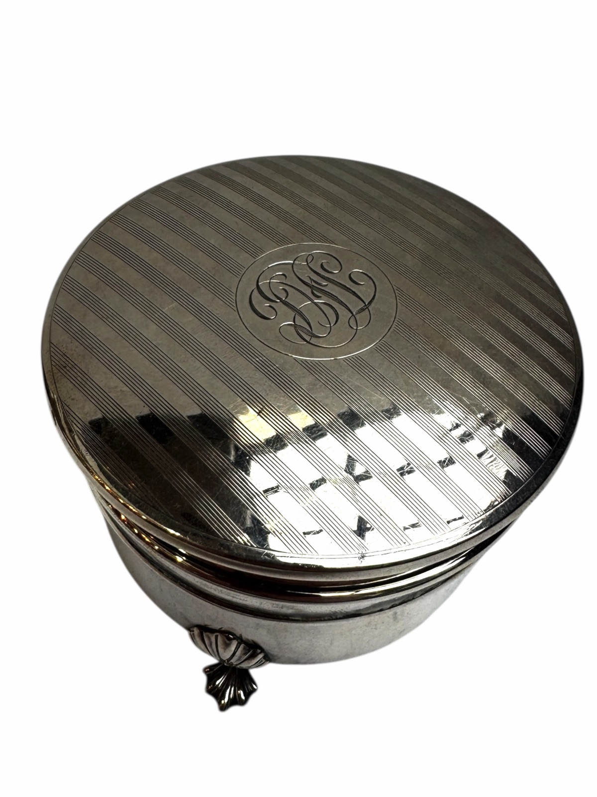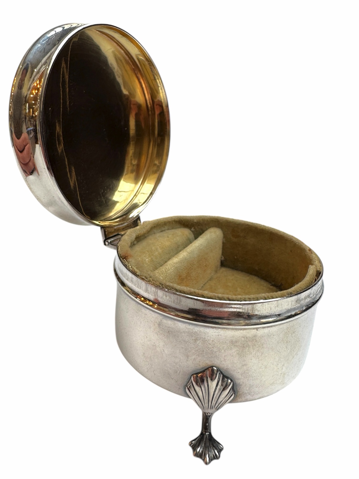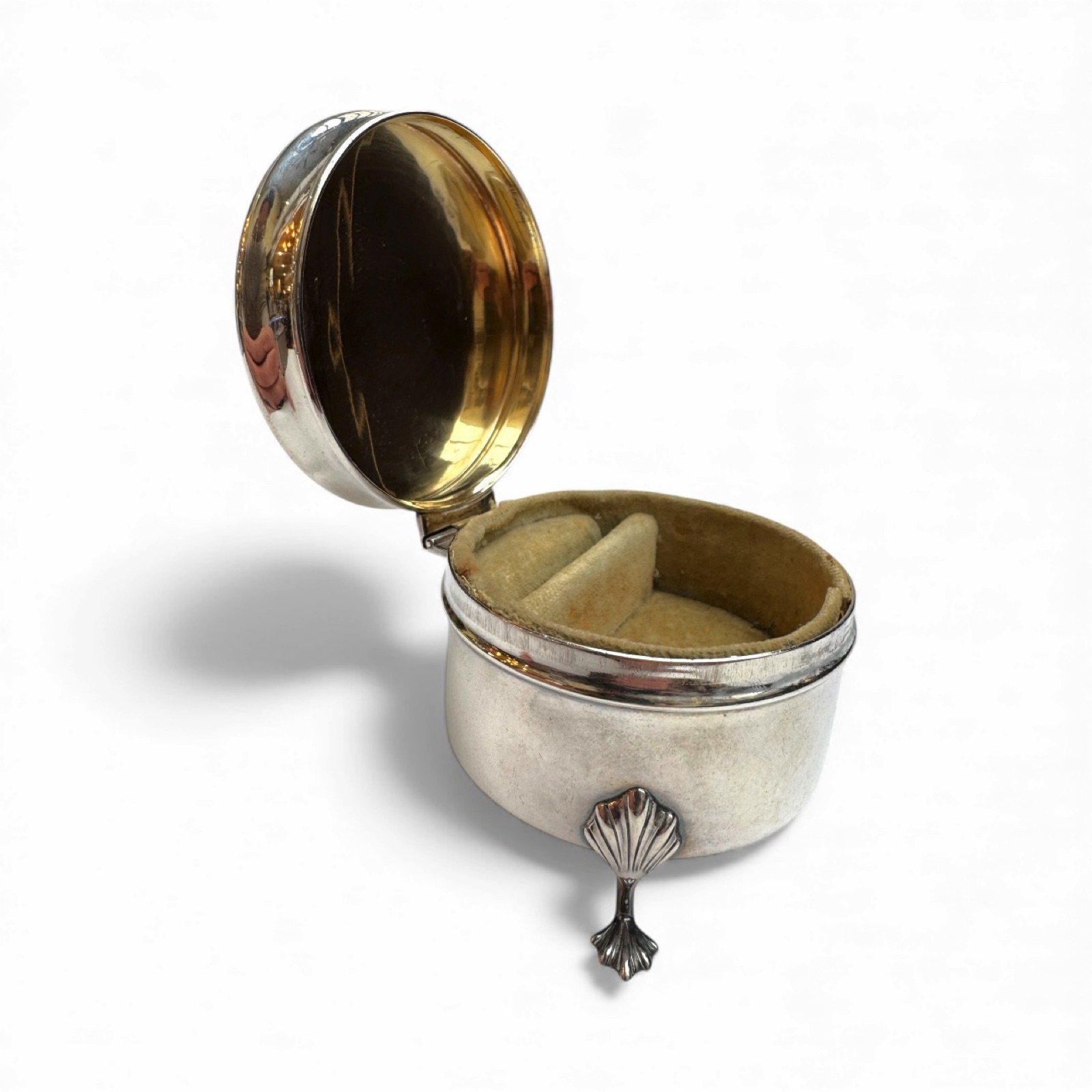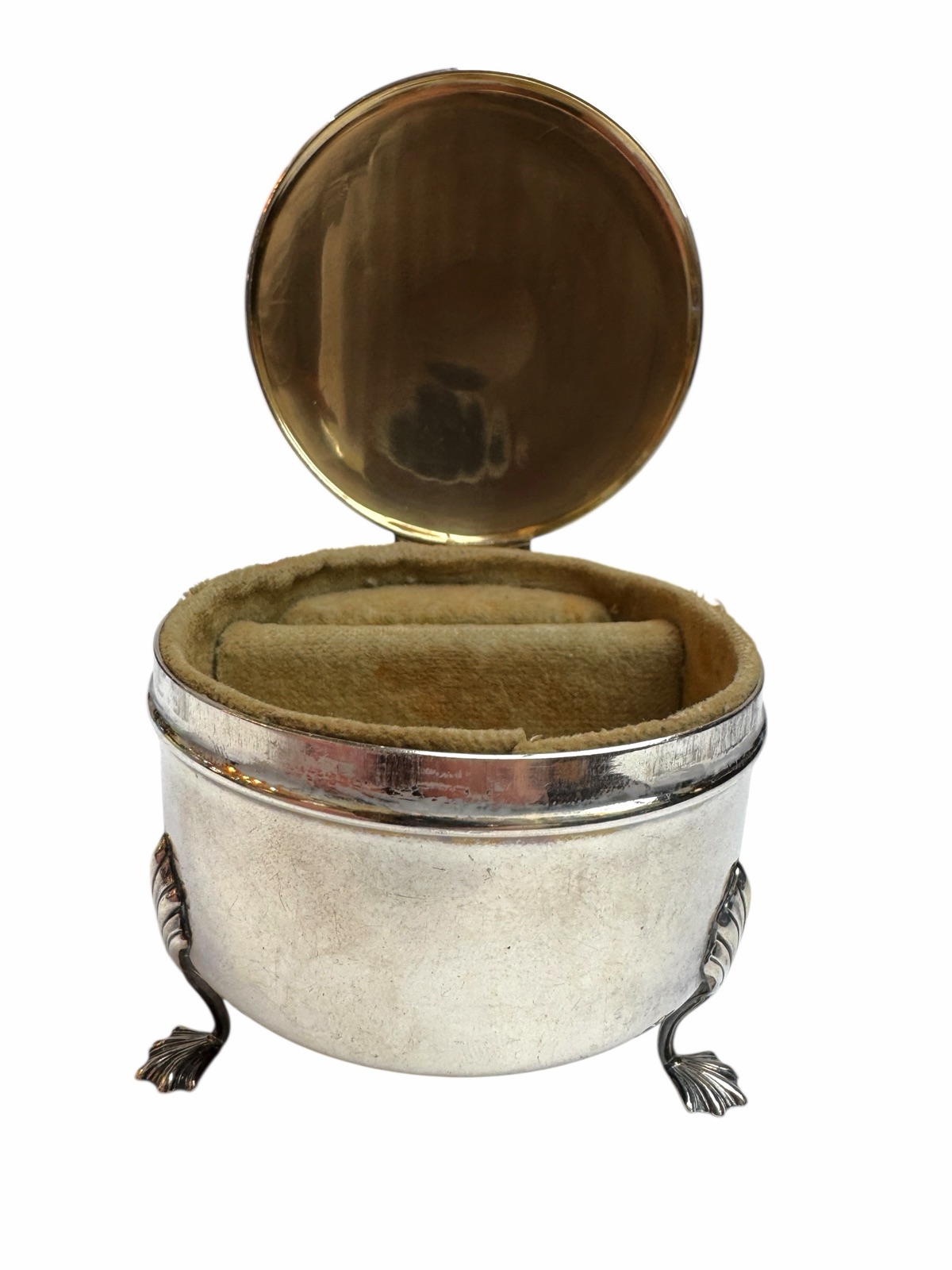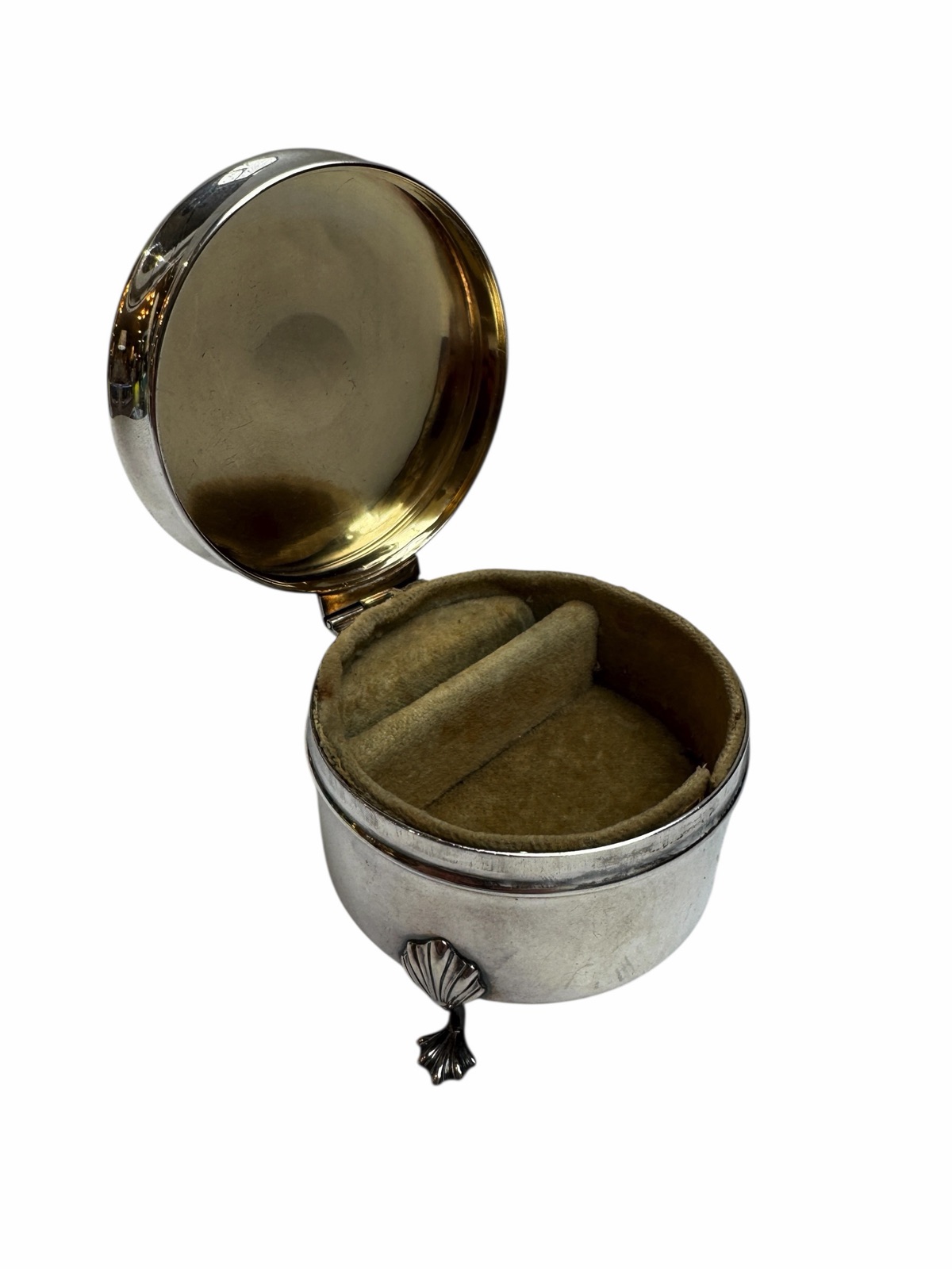 Roden Bros. embraced the Art Deco style, which was popular during the 1920s and 1930s. This jewelry box features a circular unadorned shape and an absence of the ornate classicizing motifs of previous eras. A distinctive feature of their Art Deco ring boxes was a raised base design, as shown here by 3 leaf-form feet which provides a modern, sleek appearance. Made from sterling silver and with the company’s specific maker’s mark (an “R” and a lion passant) along with a “Sterling” & “925” stamp.